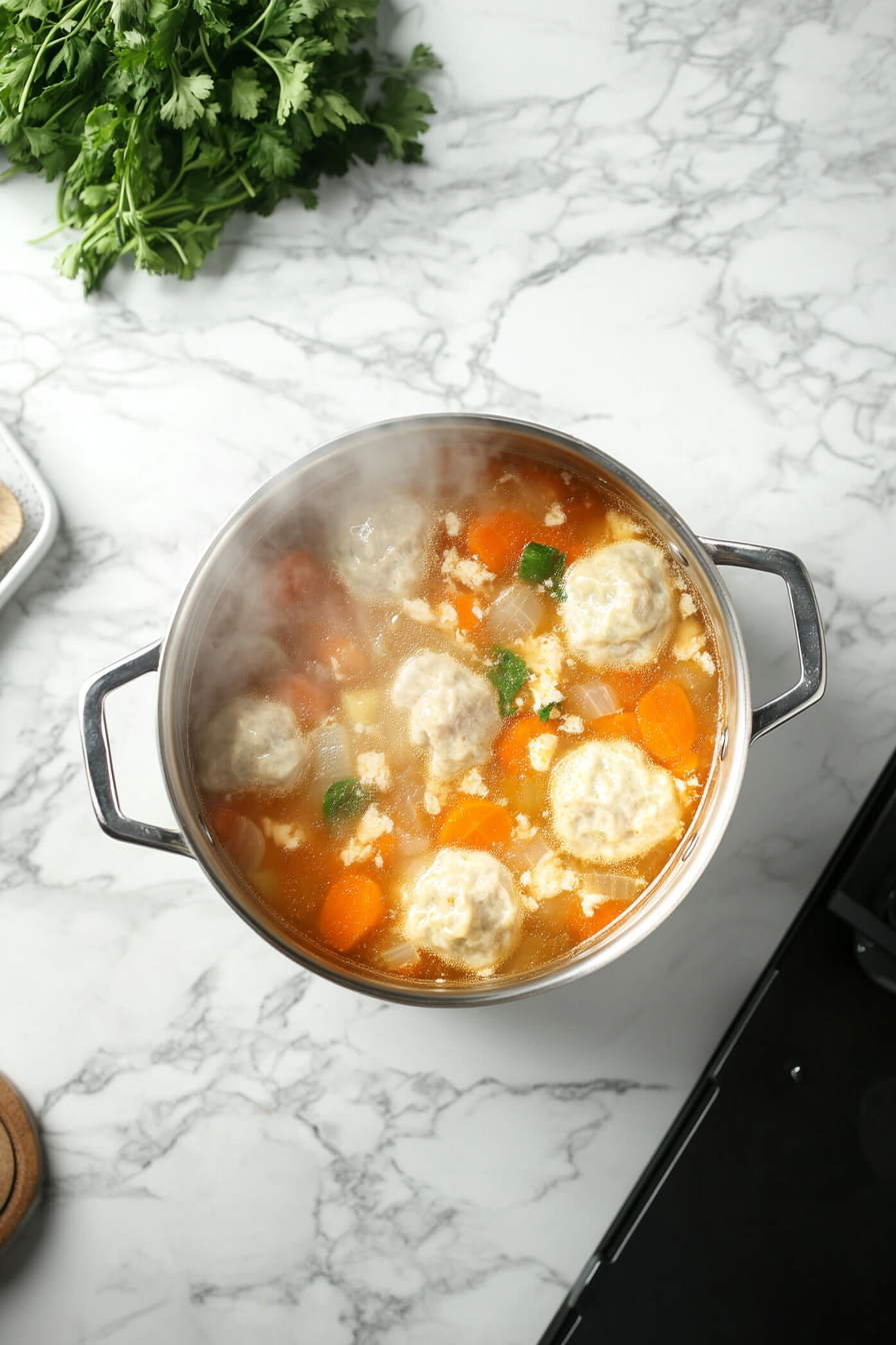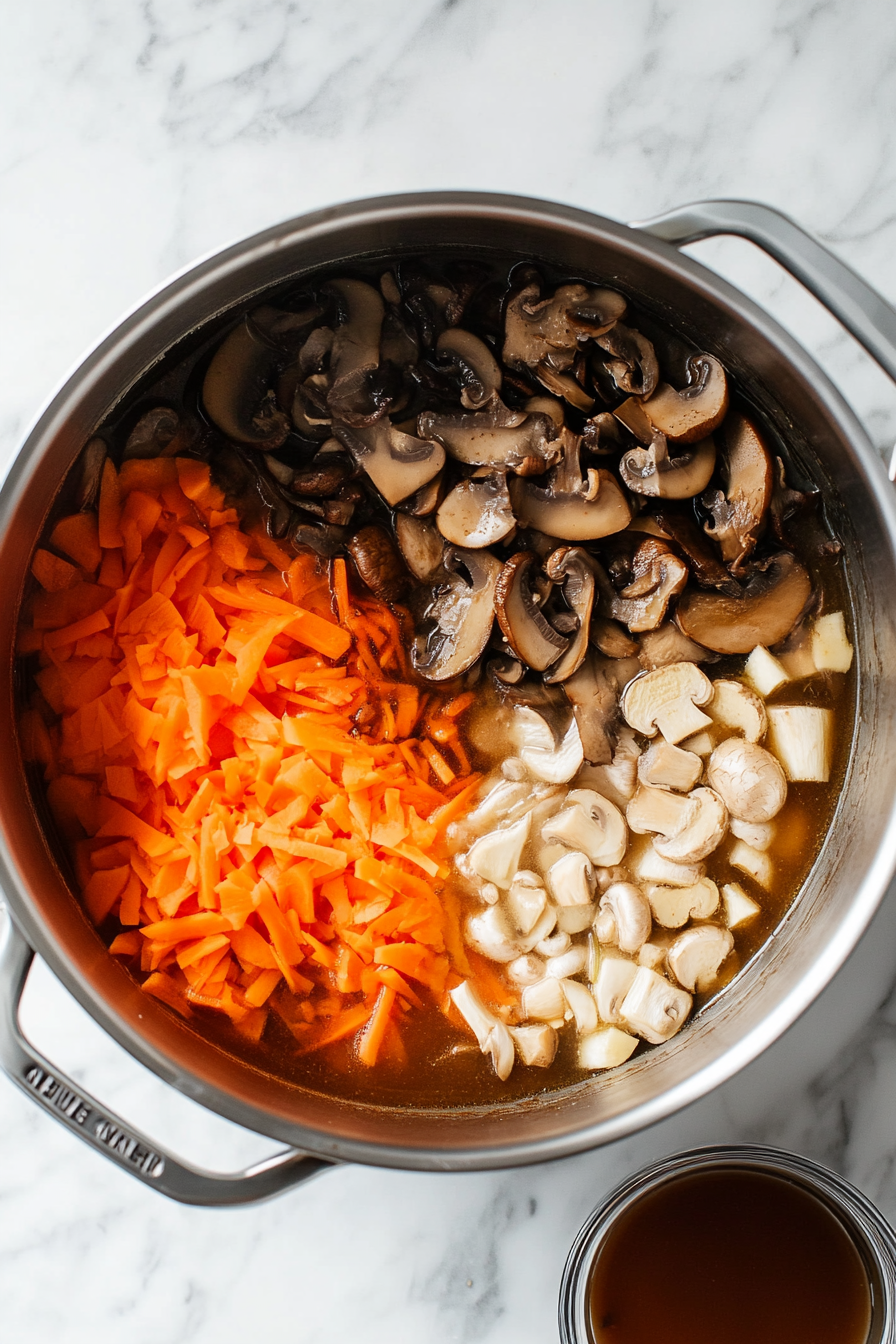 Stir in tamari, broth, garlic, ginger, carrot, dumplings, and half the scallions. Bring to a boil, then reduce heat and simmer for 4 minutes.