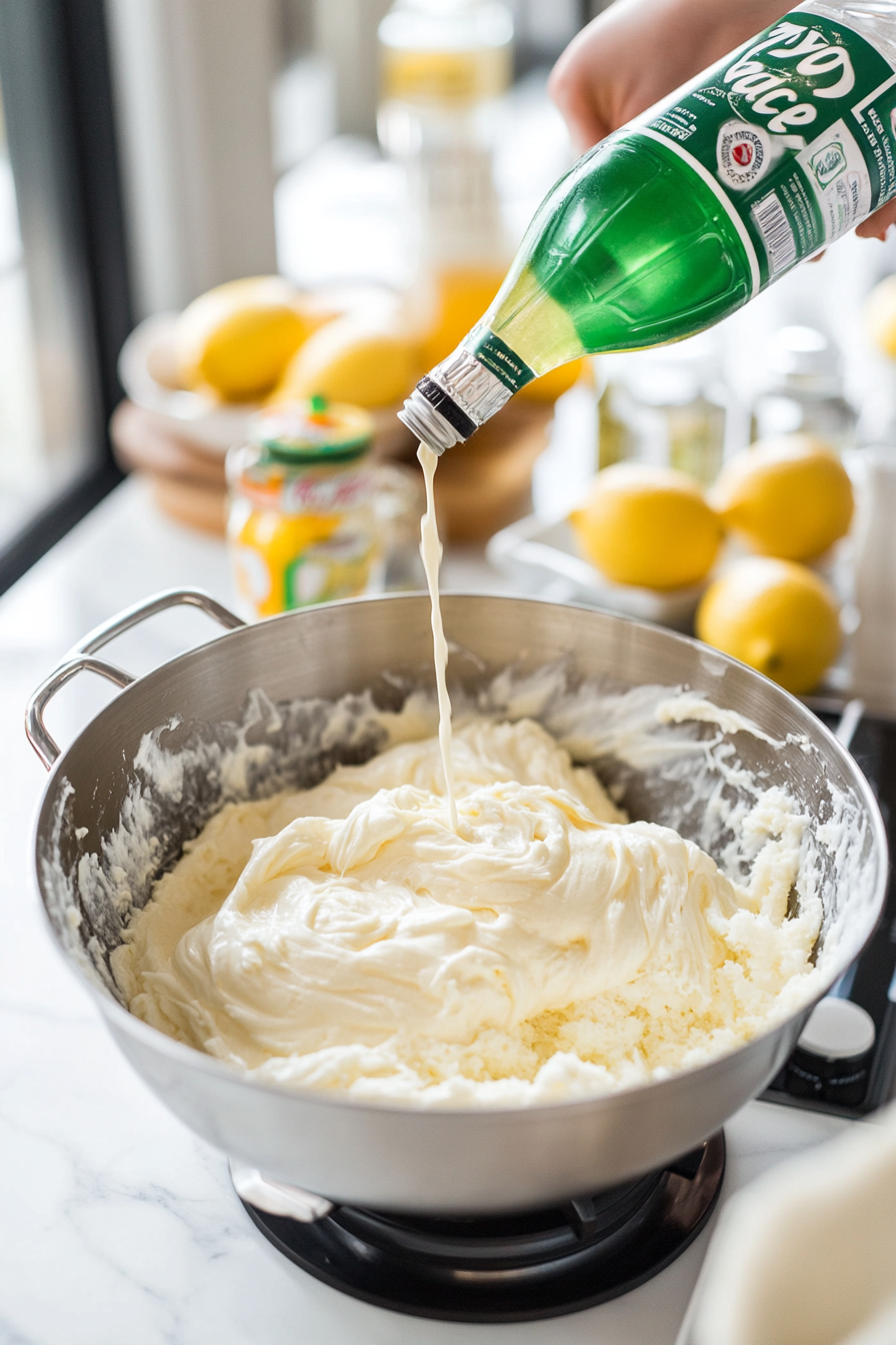 Pour in 7-Up and lemon extract, scrape the bowl, and mix until just combined.