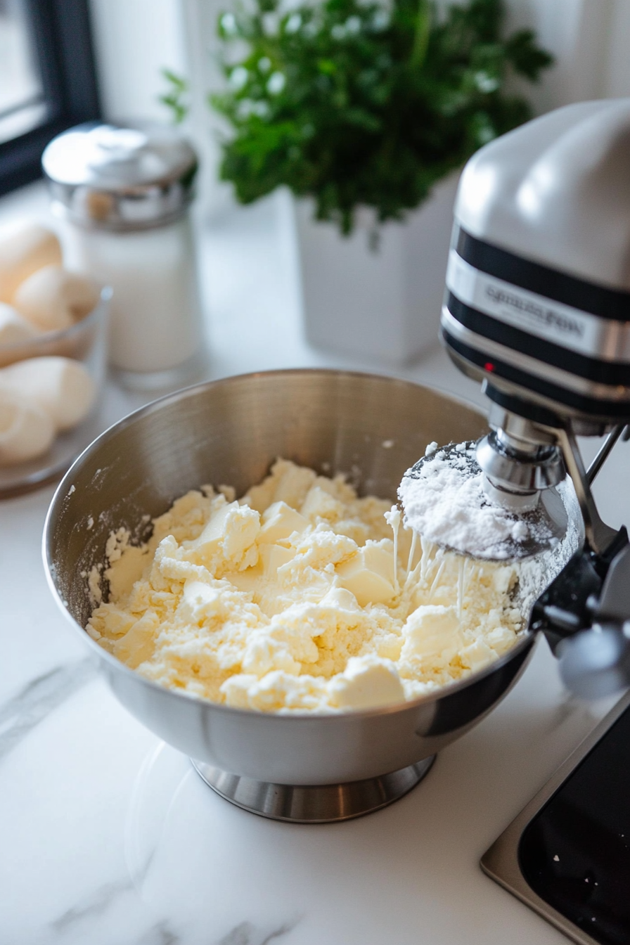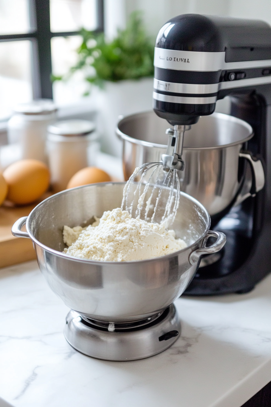 On low speed, gradually add flour in two batches, mixing gently to avoid overbeating.