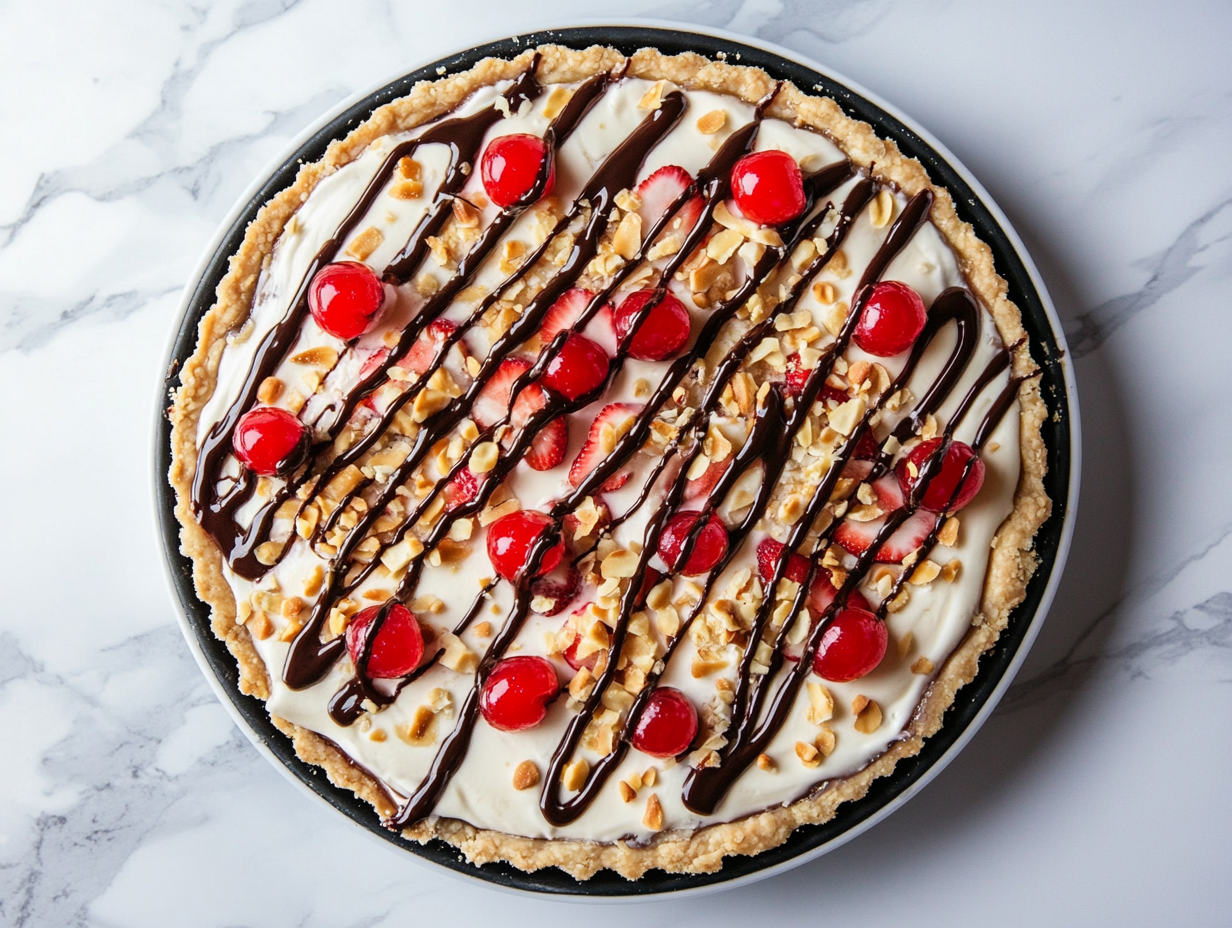 Before serving, drizzle chocolate and strawberry sauce on top, sprinkle with chopped peanuts, and garnish with maraschino cherries. Slice, serve, and enjoy!