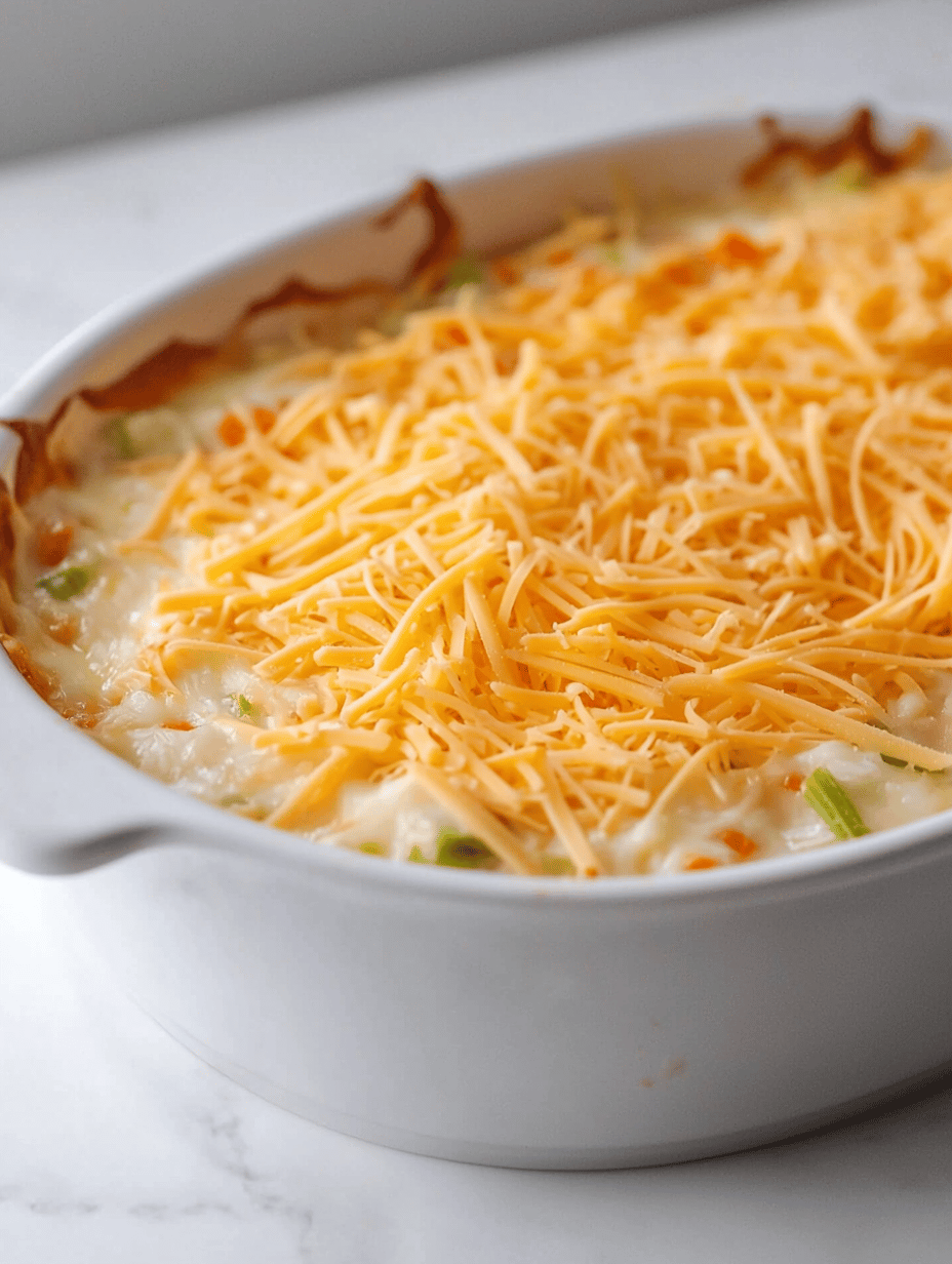 Sprinkle the shredded cheese evenly over the top of the casserole, covering all the surface for a melty, cheesy crust.