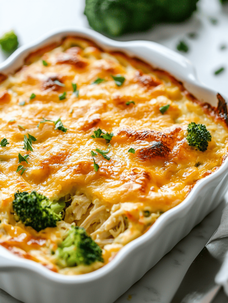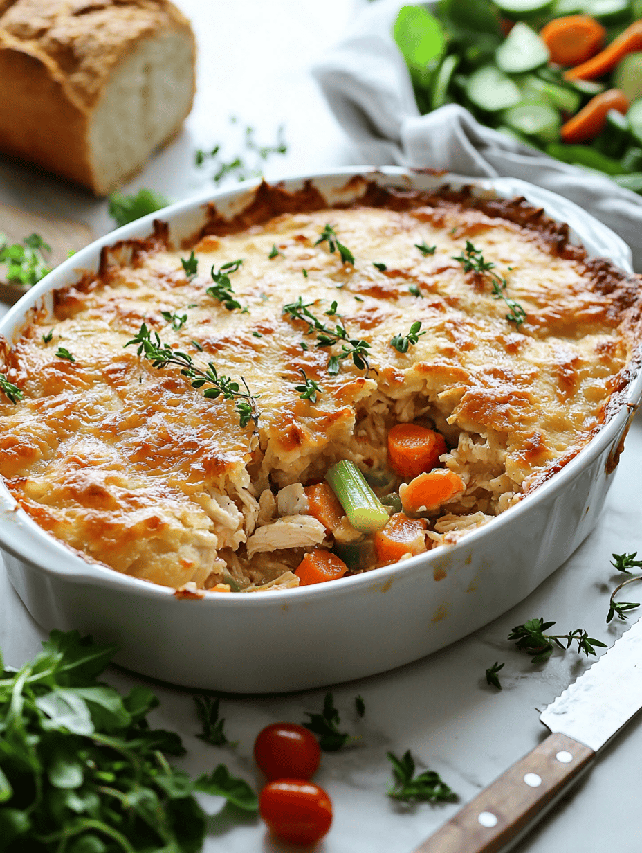This fall-inspired chicken casserole combines tender baked chicken with seasonal herbs and a creamy sauce, topped with melted cheese. It bakes until bubbly and golden, resulting in a comforting, slightly crispy-edged dish with a rich, hearty texture. The final appearance is a bubbling, cheesy casserole with visible herbs and a browned crust on top.