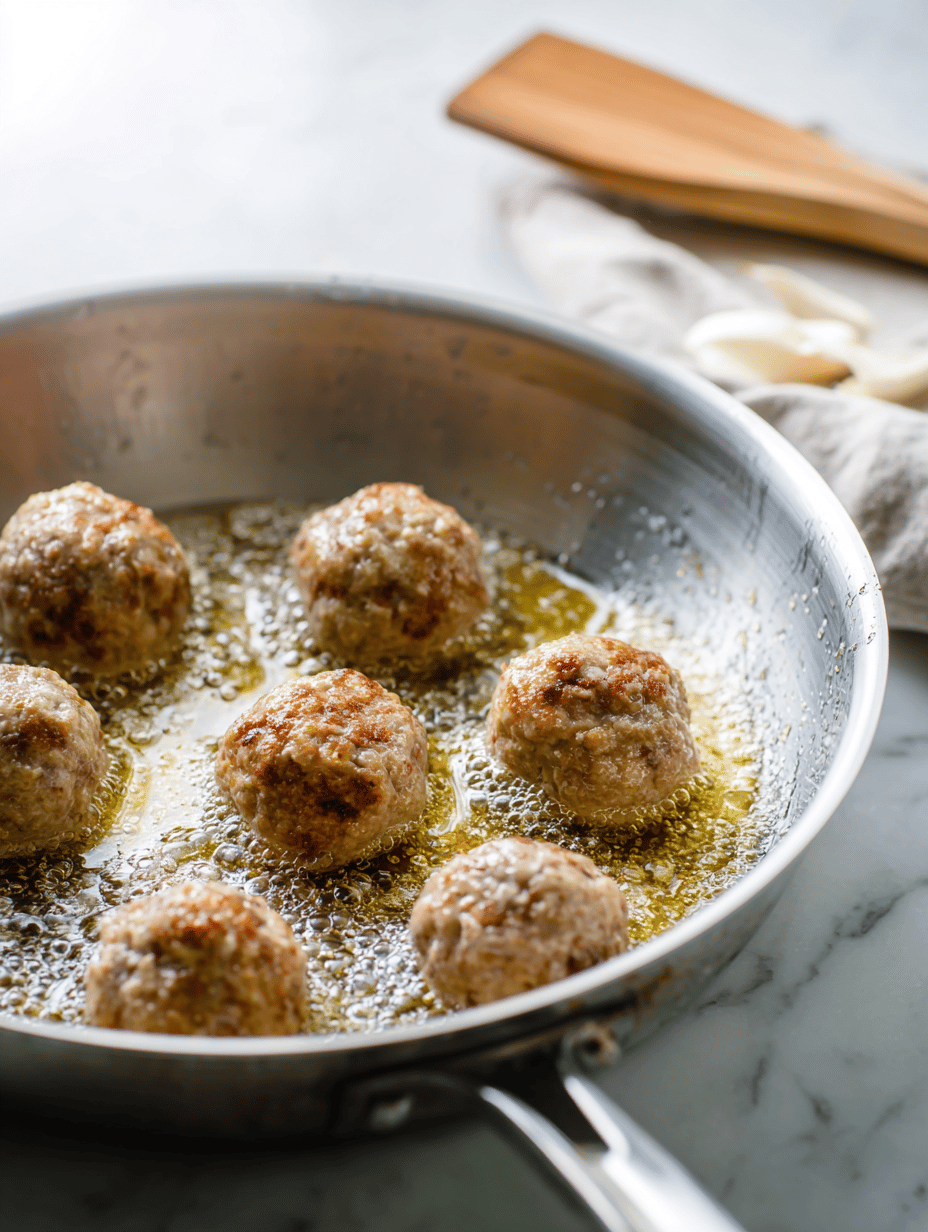 Heat the oil in a skillet or frying pan over medium-high heat. Once hot and shimmering, carefully add the meatballs, making sure not to overcrowd the pan.