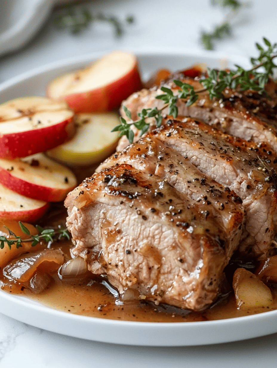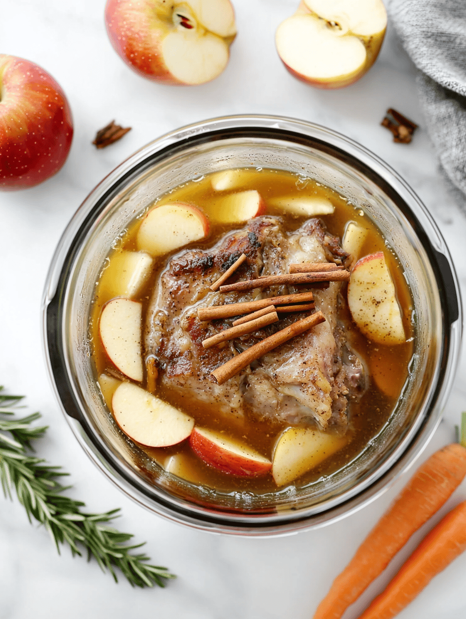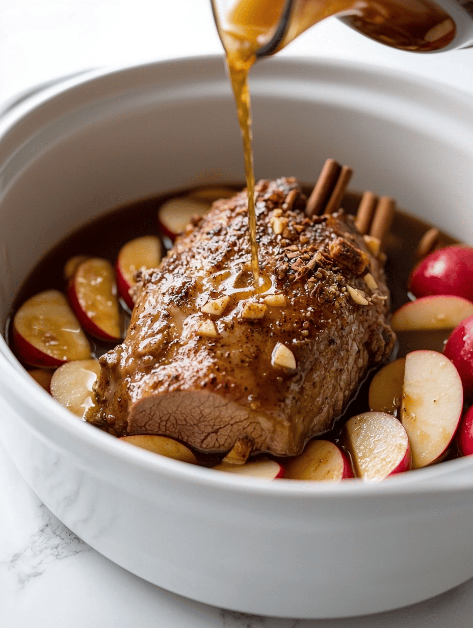 This dish features a pork roast slow-cooked with apple cider and warm spices, resulting in tender meat with a rich, flavorful glaze. The slow simmering process develops a moist texture and highlights seasonal flavors, with the final appearance showcasing a juicy, caramelized exterior and a fragrant, festive sauce.