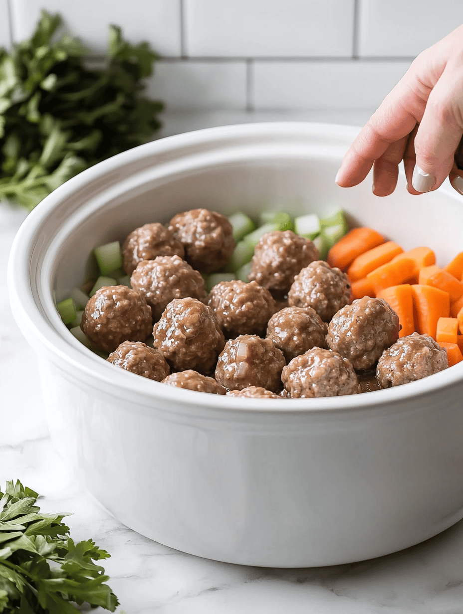 Cover the slow cooker and set it on low. Let the soup simmer for about 4 to 6 hours until the meatballs are cooked through and flavors meld, filling your kitchen with warm, savory aromas.