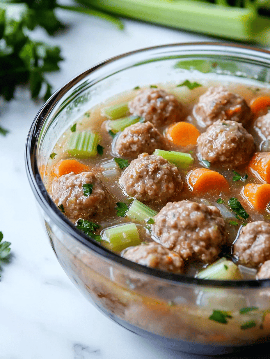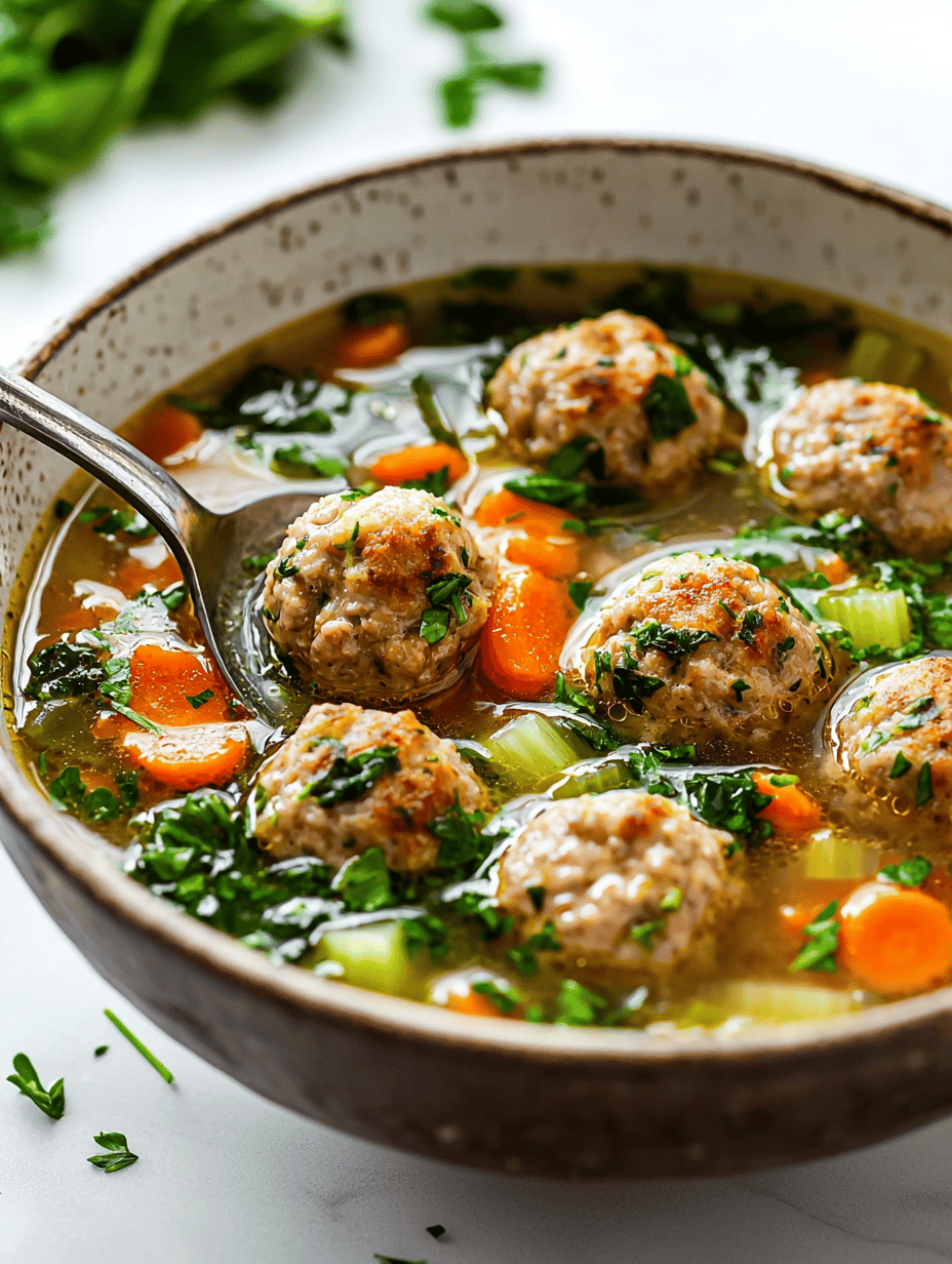 Scoop the warm, inviting soup into bowls, ensuring each serving includes a few tender meatballs along with the vibrant vegetables and herbs. Serve hot and enjoy the comforting, seasonal flavors.