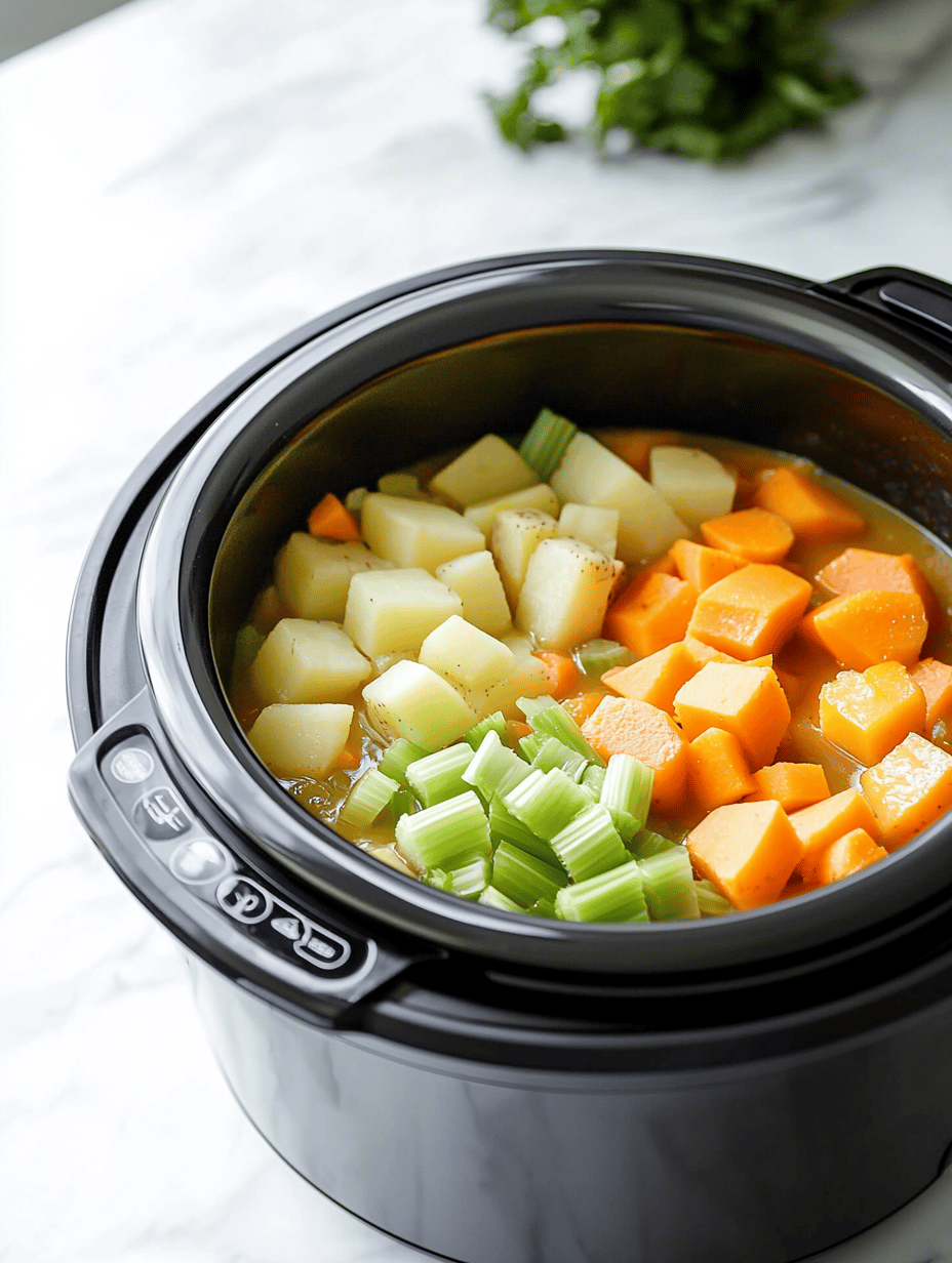 Set the slow cooker to low and cook for about 6 hours, until the vegetables are tender and easily mashable. The house will fill with a warm, inviting aroma during this time.