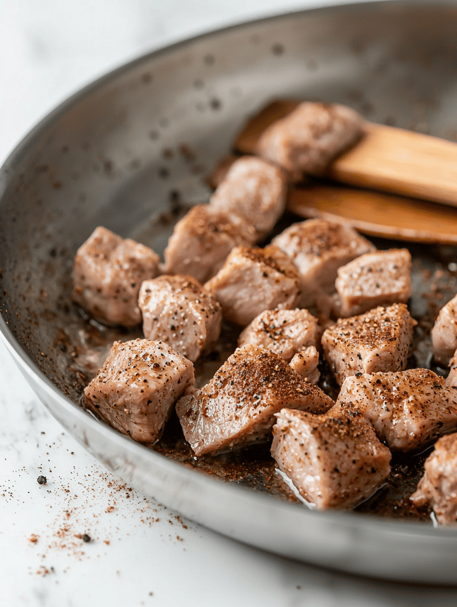 Season the pork chunks with salt, pepper, cumin, and cinnamon. Heat a skillet over medium-high heat and sear the pork until browned on all sides, releasing a rich aroma.