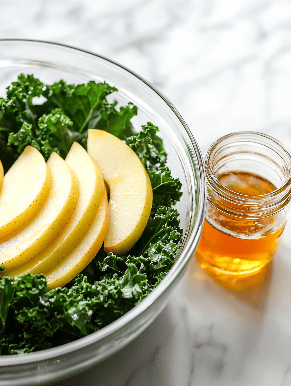 While the pork cooks, prepare the slaw by combining sliced apples and chopped kale in a large bowl. In a small jar, whisk together maple syrup, apple cider vinegar, and olive oil, then pour over the slaw ingredients. Toss gently until evenly coated and the kale begins to soften.