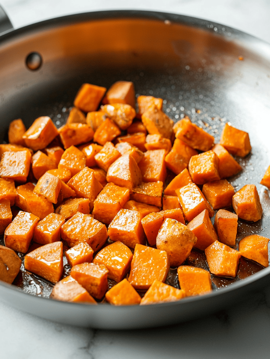 Heat a tablespoon of olive oil in the skillet over medium heat. Add the diced sweet potato and cook, stirring occasionally, until they are tender and lightly browned, about 8 minutes.