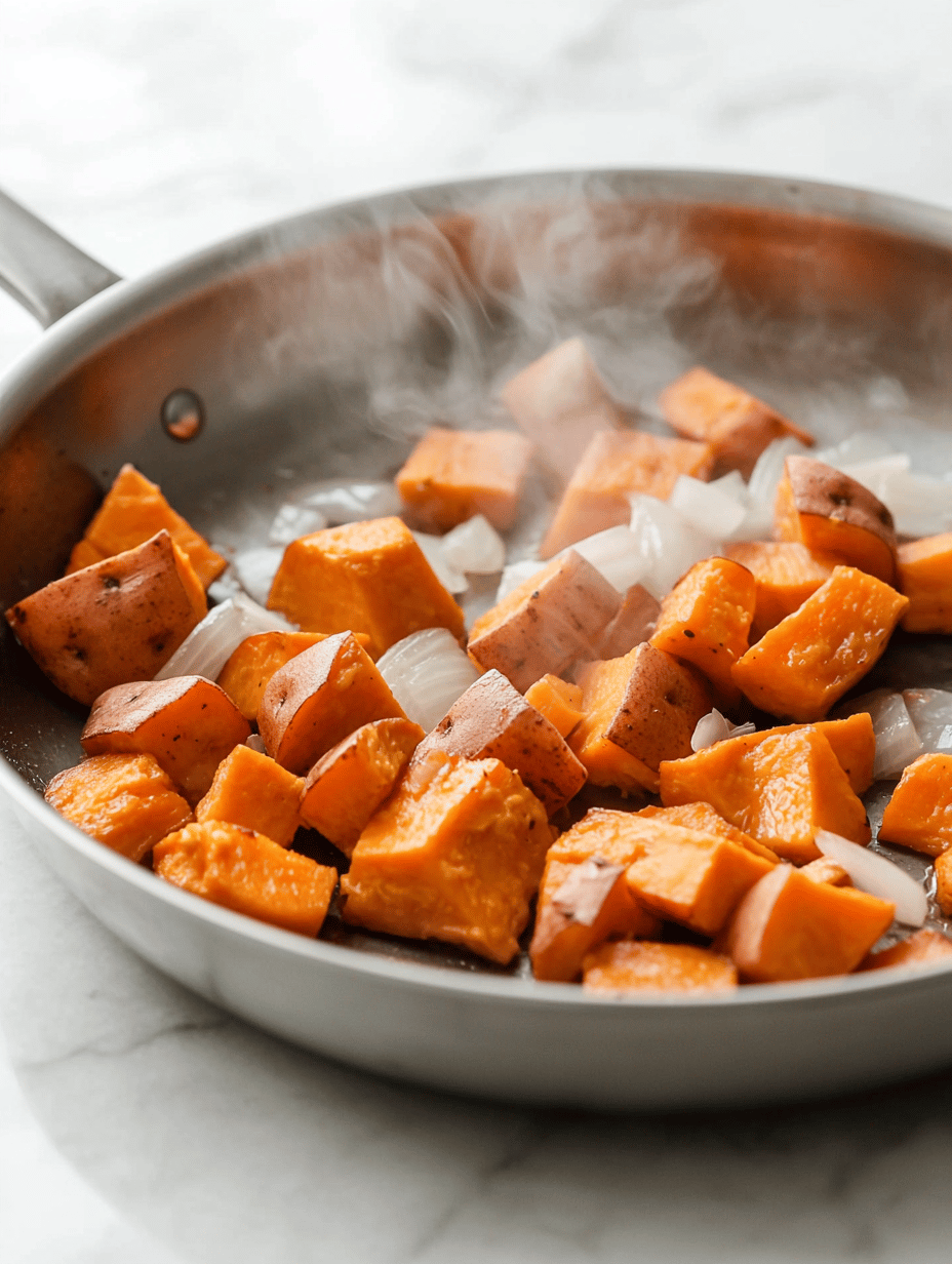 Add the sliced onion to the skillet with the sweet potatoes, cooking until the onions are translucent and fragrant, about 3-4 minutes.
