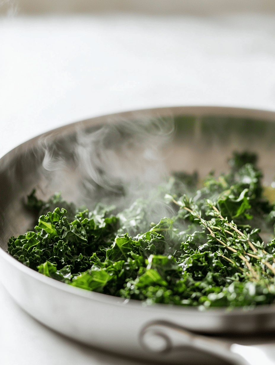 Stir in the chopped kale and chopped thyme, cooking until the kale wilts and reduces in volume, about 2-3 minutes. Season with salt and pepper to taste.