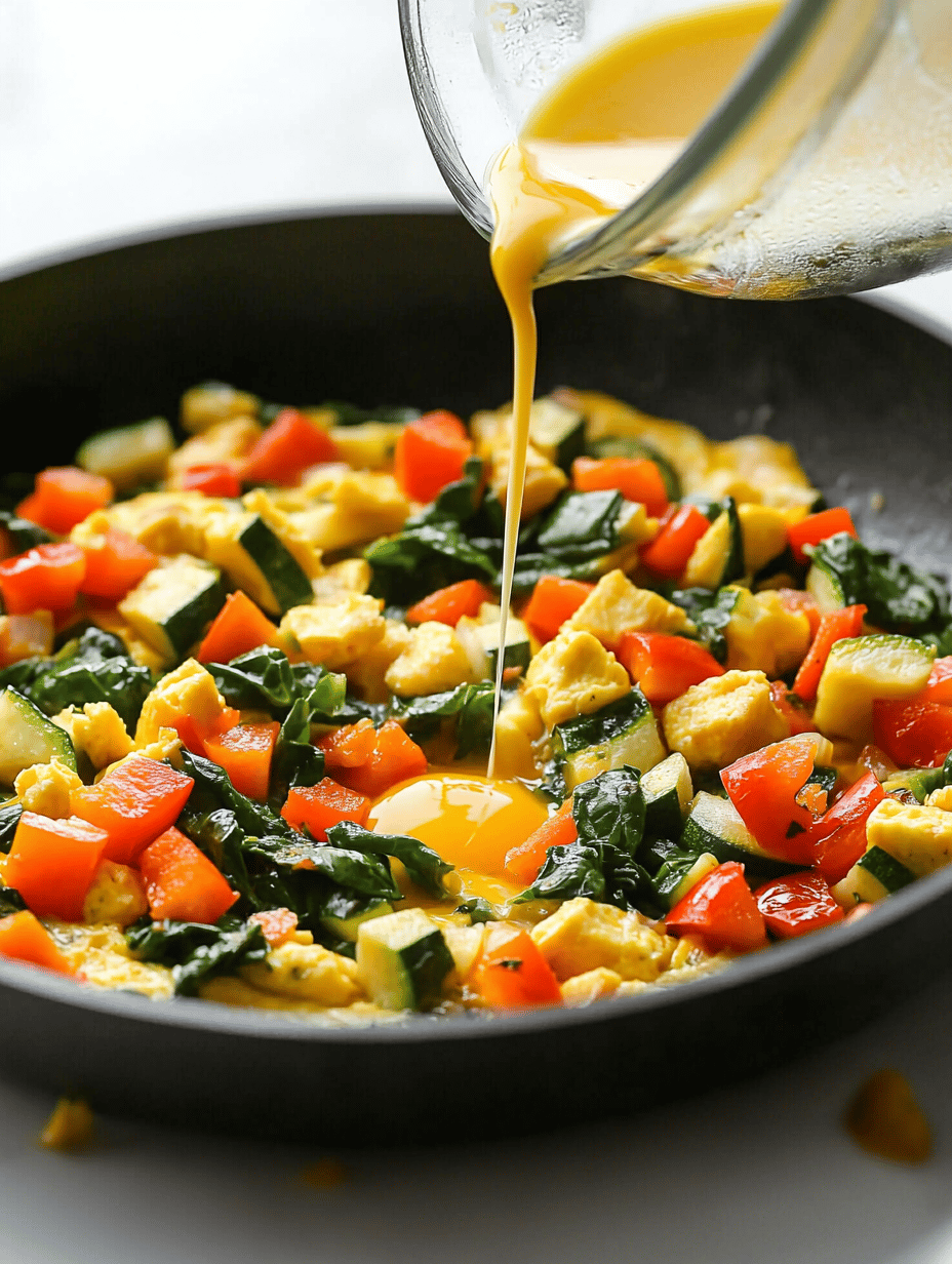 Pour the beaten eggs evenly over the sautéed vegetables in the skillet. Give it a gentle stir to distribute everything evenly.