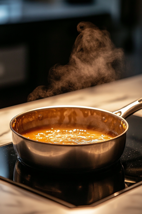Heat sugar and water in a saucepan until it melts and turns deep golden.
