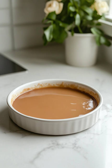 Pour the caramel into my baking dish and tilt it to coat the bottom.