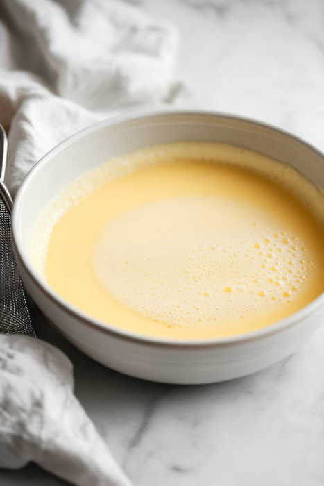 In a bowl, whisk eggs, condensed milk, evaporated milk, vanilla, and salt.