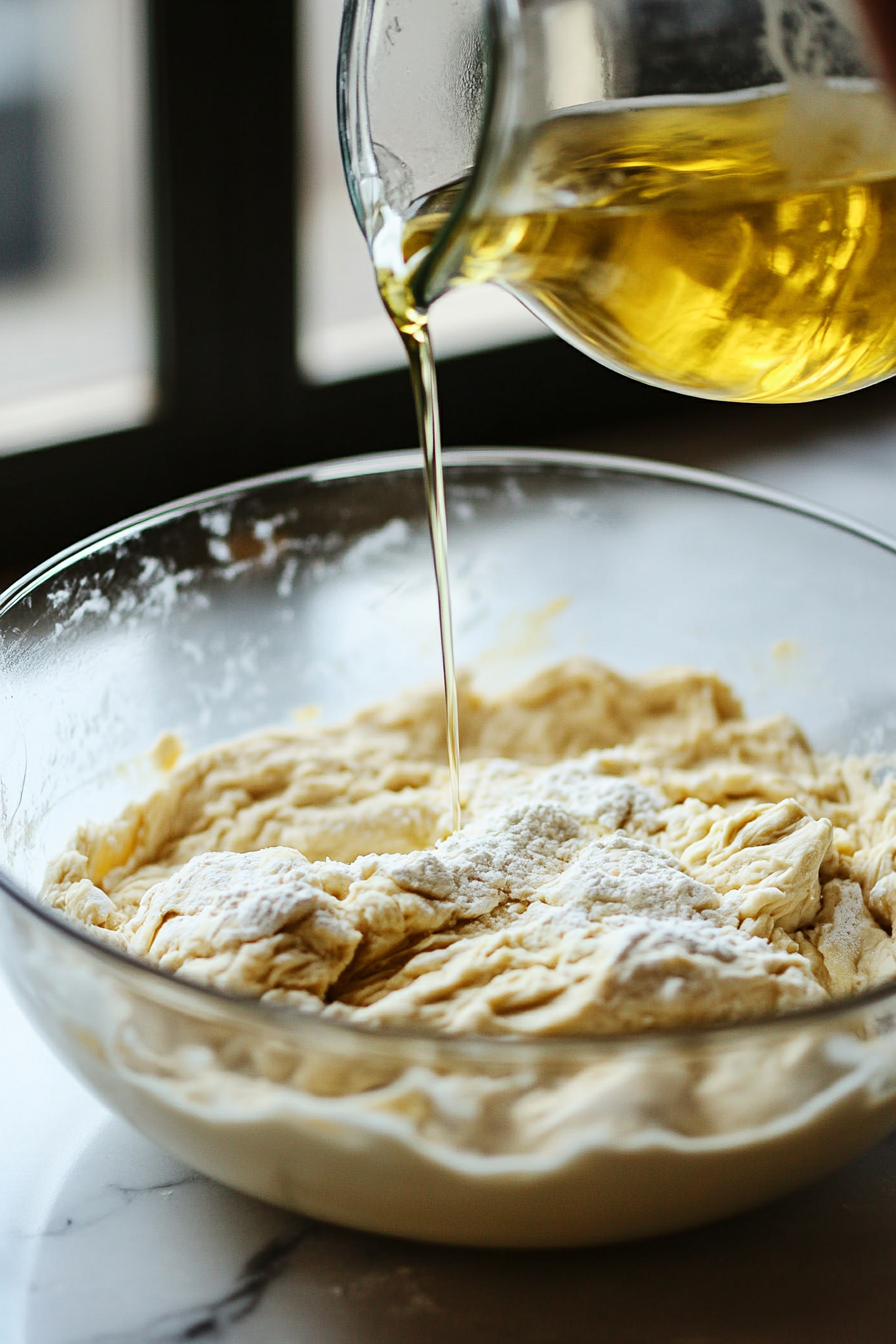 Add olive oil and warm water, then mix until a dough forms.