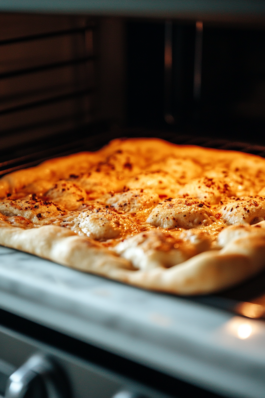 Punch down the risen dough and transfer it to a greased baking sheet, gently stretching it to fit.
