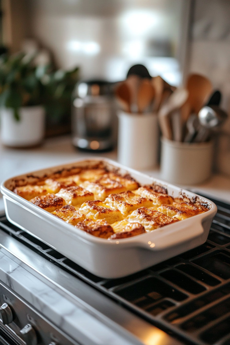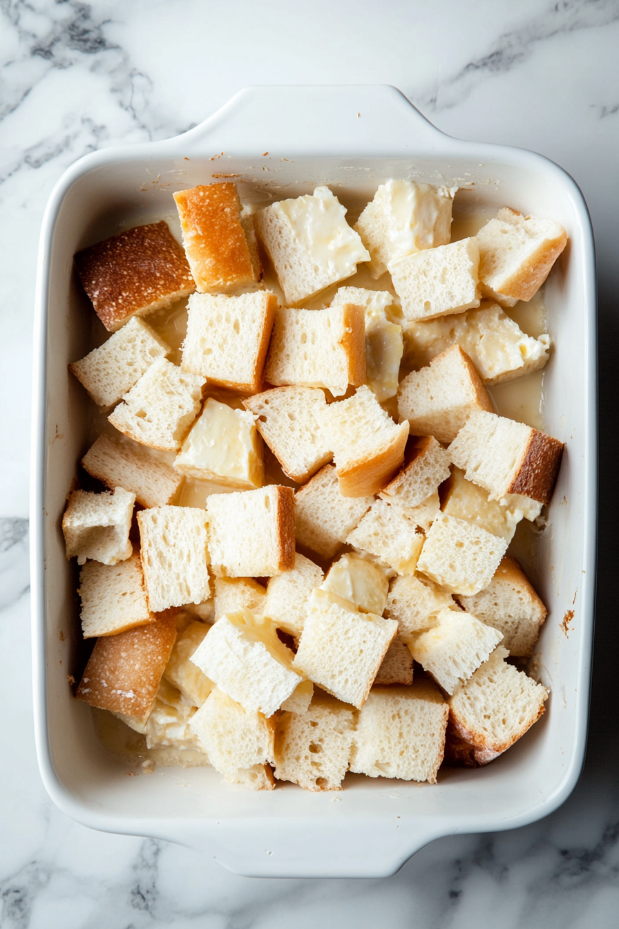 Cut bread into 1-inch cubes and arrange evenly in a greased 9x13-inch baking dish.