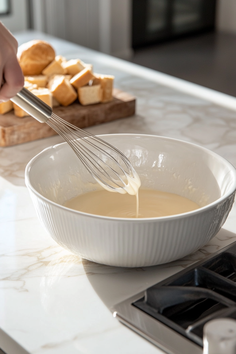 Whisk eggs, milk, heavy cream, vanilla, and sugar in a bowl, then pour over the bread.