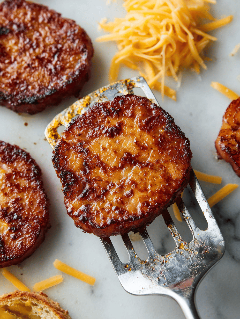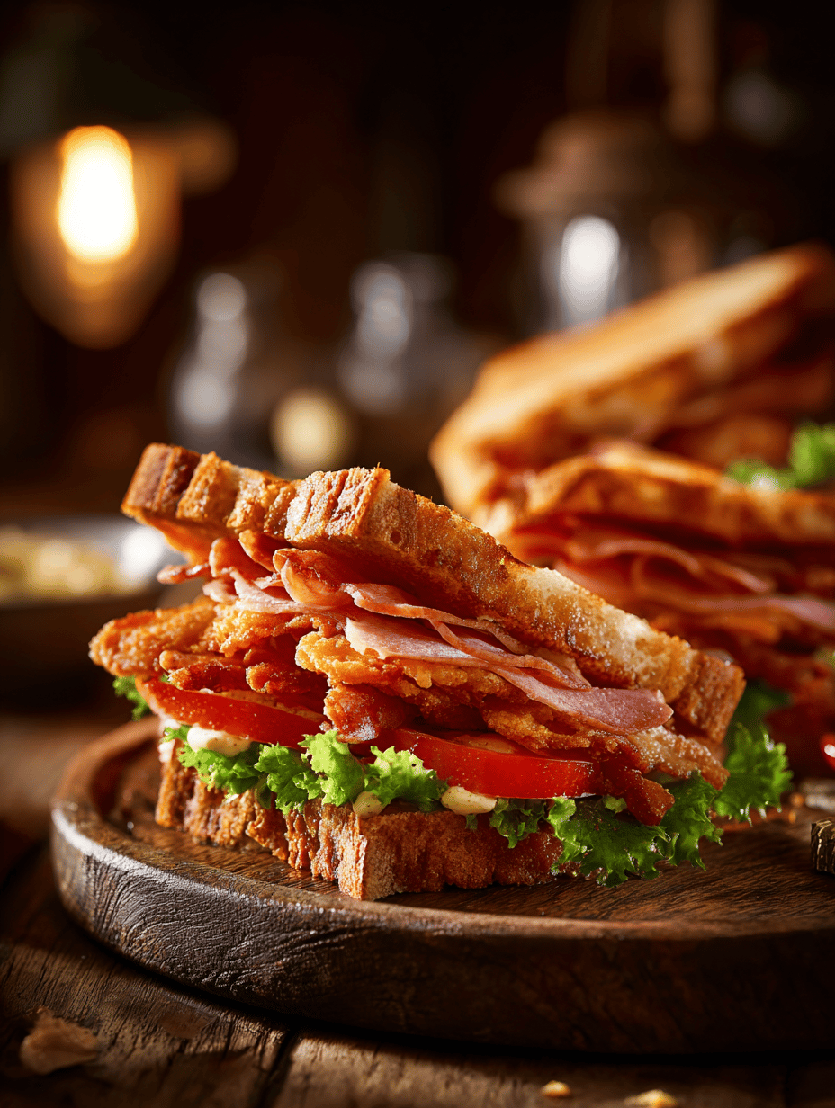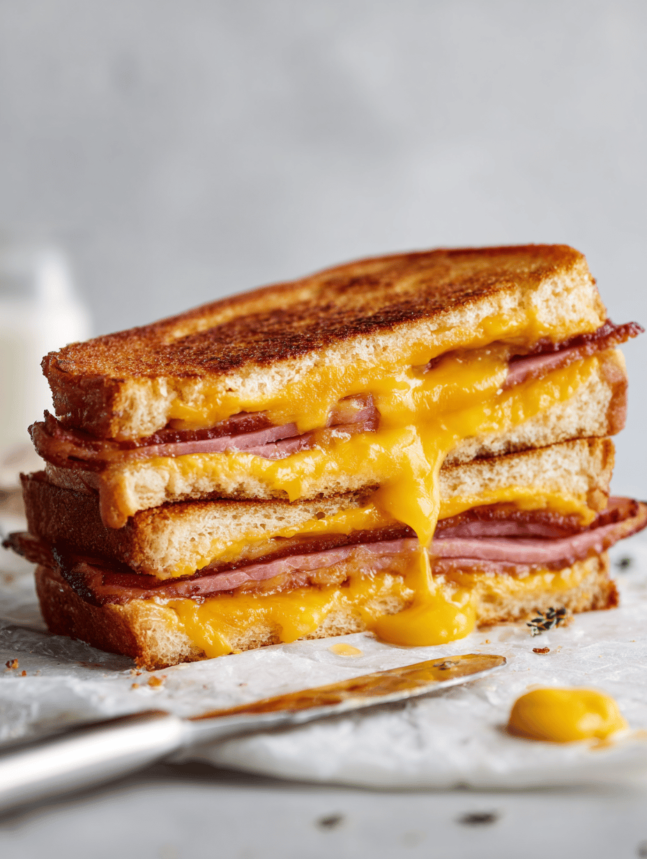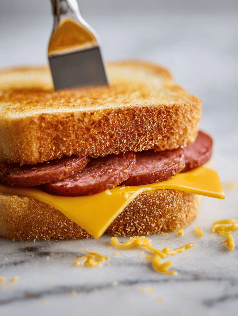 Cut the sandwich in half if desired, revealing the crispy edges, melty cheese, and smoky slices, then serve immediately and enjoy the satisfying crunch and savory aroma.