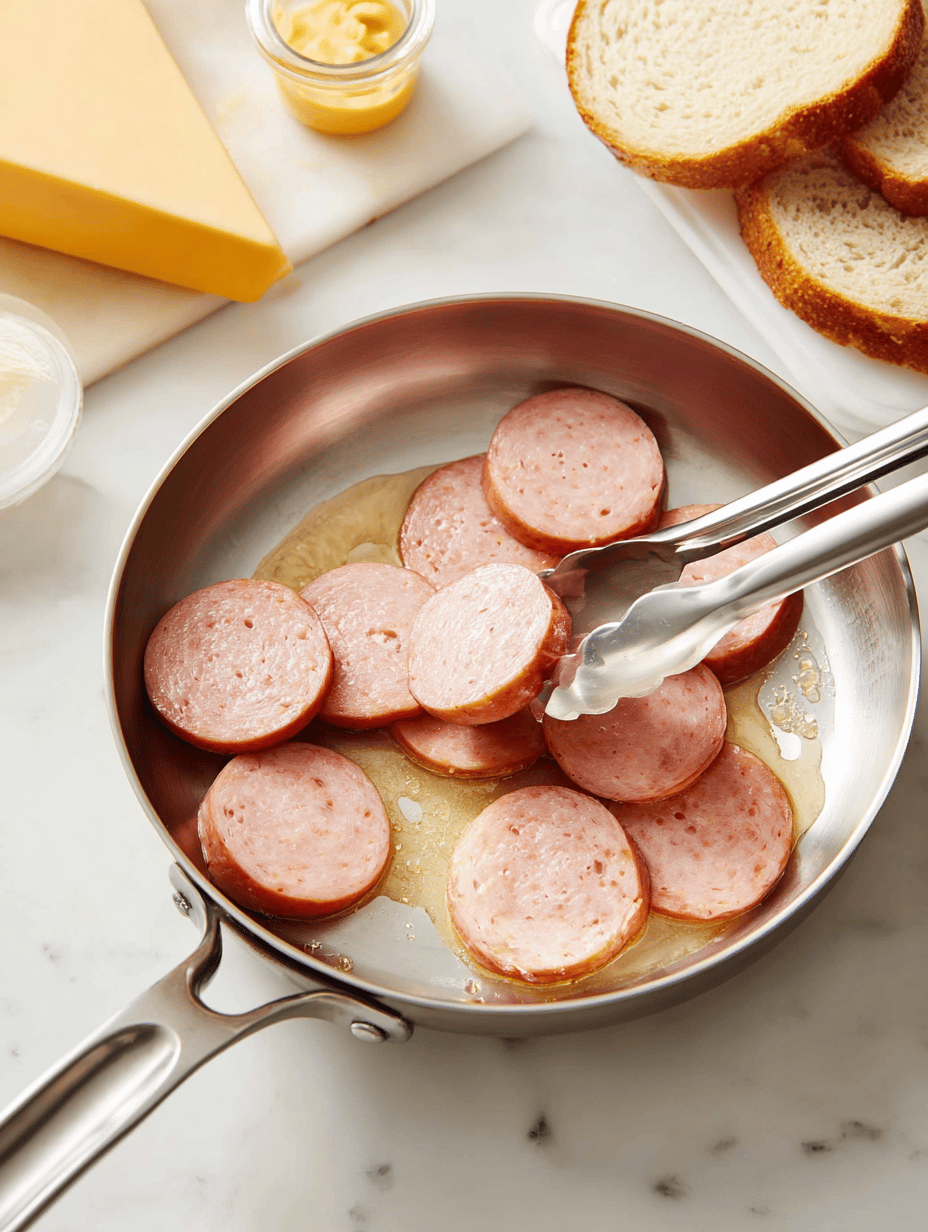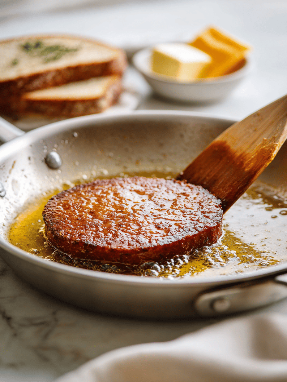Cook the bologna undisturbed for about 2-3 minutes, watching as the edges turn a deep golden brown and crispy, and the meat begins to sizzle.