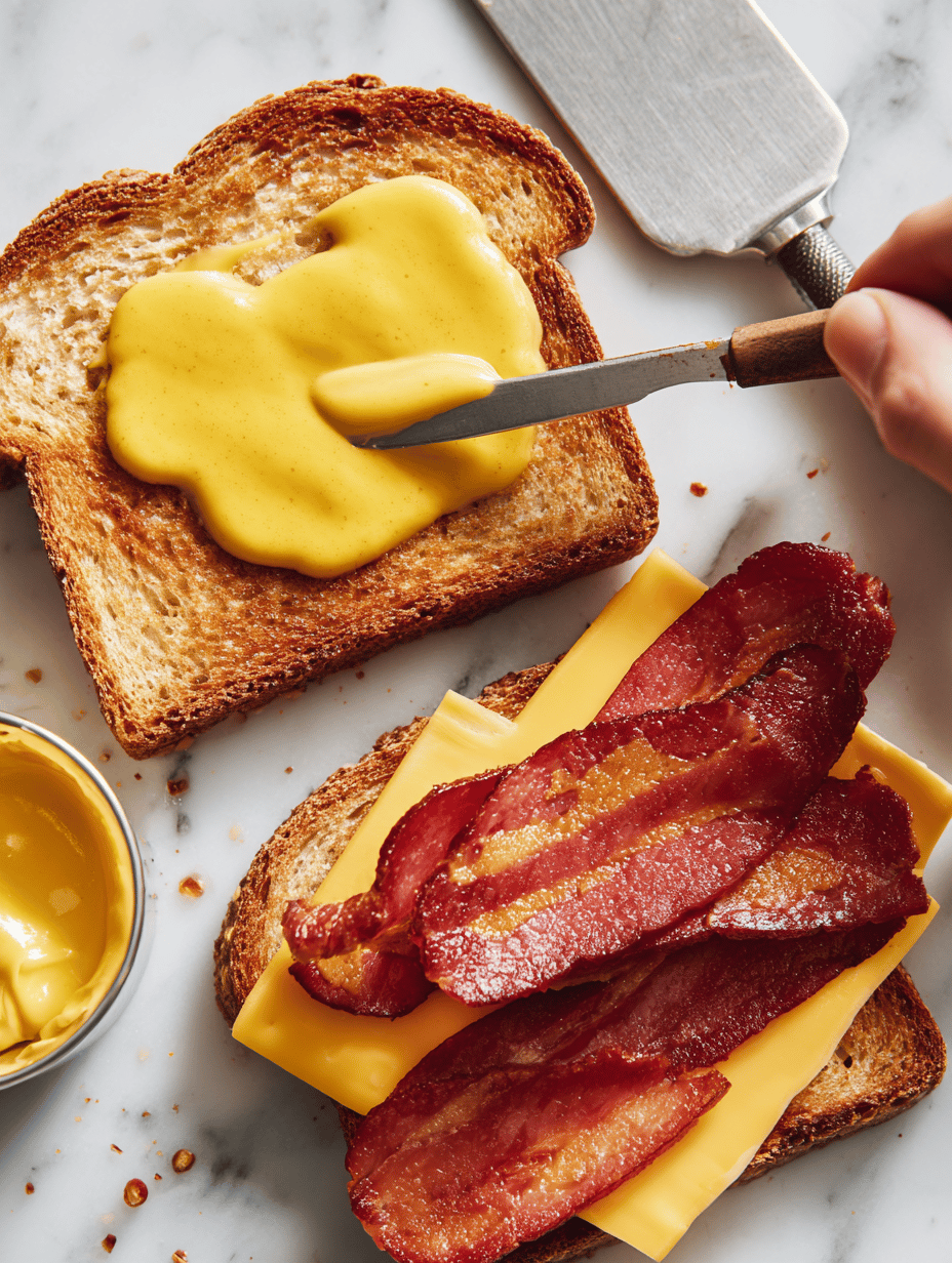 Spread mustard or your preferred condiment on one side of each toasted bread slice, then layer the crispy bologna with melted cheese onto one slice.