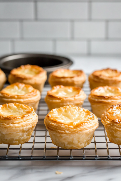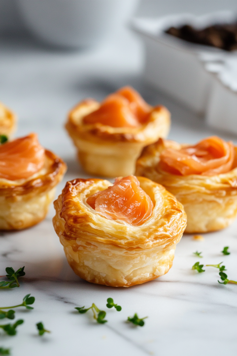 Prepare the Puff PastryCut the puff pastry sheets into circles slightly larger than your muffin cups.Press each circle gently into the tin, this will help the pastry puff into a neat, bowl-like shape. Bake the Pastry ShellsBake at 400°F (200°C) for about 12–15 minutes or until crisp and golden. The layers should rise and separate slightly, forming a light, flaky cup. Cool the Pastry CompletelyRemove the shells from the tin and let them cool on a rack. If they’re warm, the filling will melt, so make sure they cool fully. Prepare the Cream ToppingIn a small bowl, whisk crème fraîche or whipped cream cheese until smooth. You can add a pinch of lemon zest or black pepper if you want a bit more flavor. Fold the Smoked SalmonSlice the smoked salmon into long, soft ribbons. Fold each ribbon loosely so it fits naturally into the pastry cups without being packed tight. Fill Each Pastry CupAdd the folded smoked salmon inside each cup, keeping the texture light and airy. The pastry should still be visible around the edges. Add the CreamPlace a small spoonful of your cream mixture on top of the salmon. This adds a smooth layer that balances the saltiness. Finish With Caviar & ProsciuttoTop each cup with a small spoon of caviar for a clean, briny pop. Add a small ribbon of prosciutto on the side and finish with fresh herbs like dill or chives. Serving StepServe these cups chilled so the pastry stays crisp and the toppings stay firm. They work beautifully as an appetizer for gatherings or as a small, refined bite.