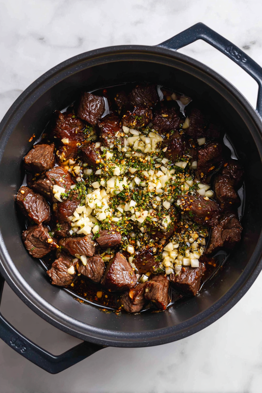 Drain excess fat and return pot to stove. Add minced garlic and cook until fragrant.