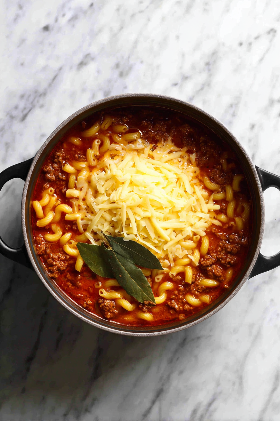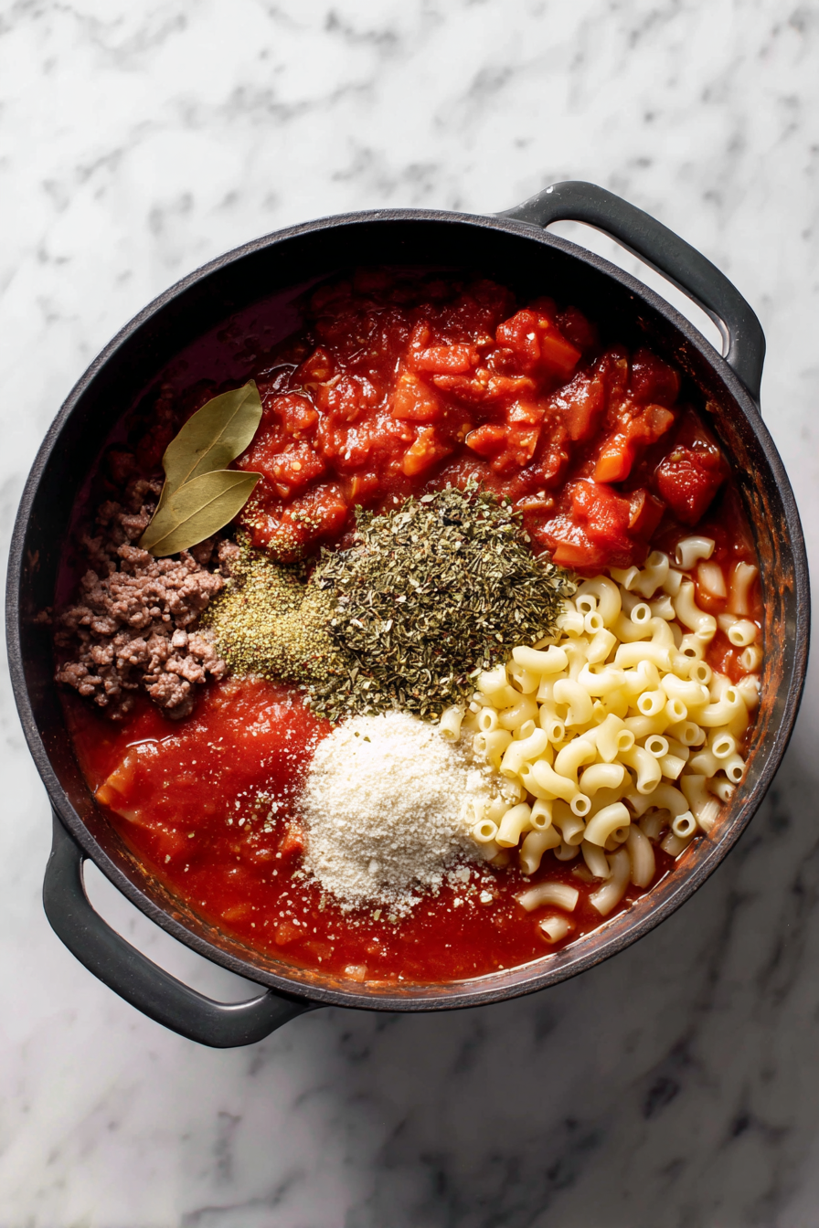Pour in tomato sauce, diced tomatoes, beef broth, Worcestershire sauce, seasoned salt, Italian seasoning, bay leaves, and uncooked macaroni noodles.
