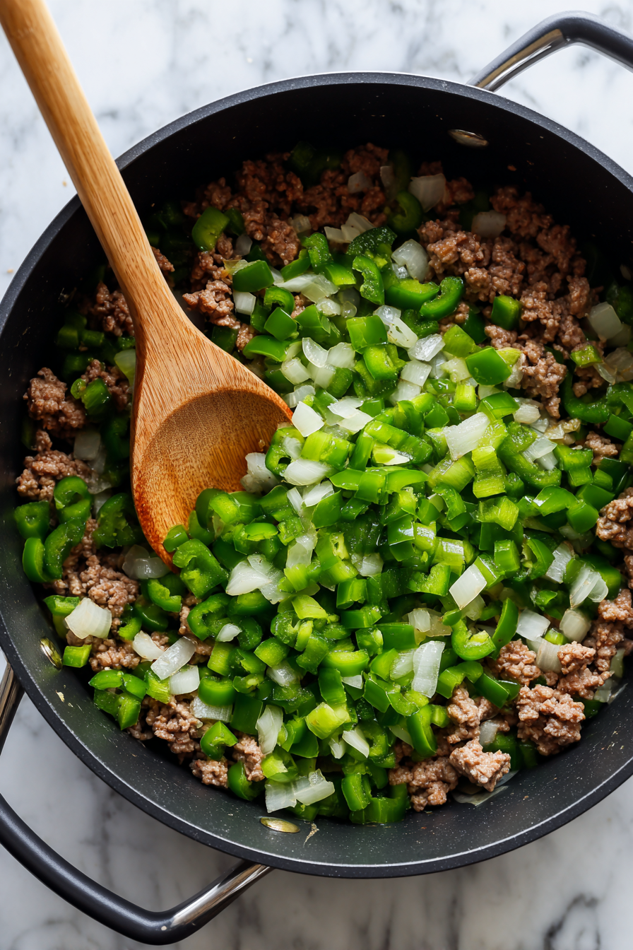 Heat olive oil in a large pot, then sauté onion, bell pepper, and ground beef until beef is no longer pink.