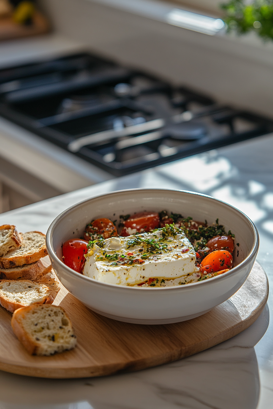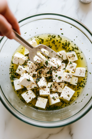 Cut feta into ½-inch cubes and gently toss with the olive oil mixture until coated.
