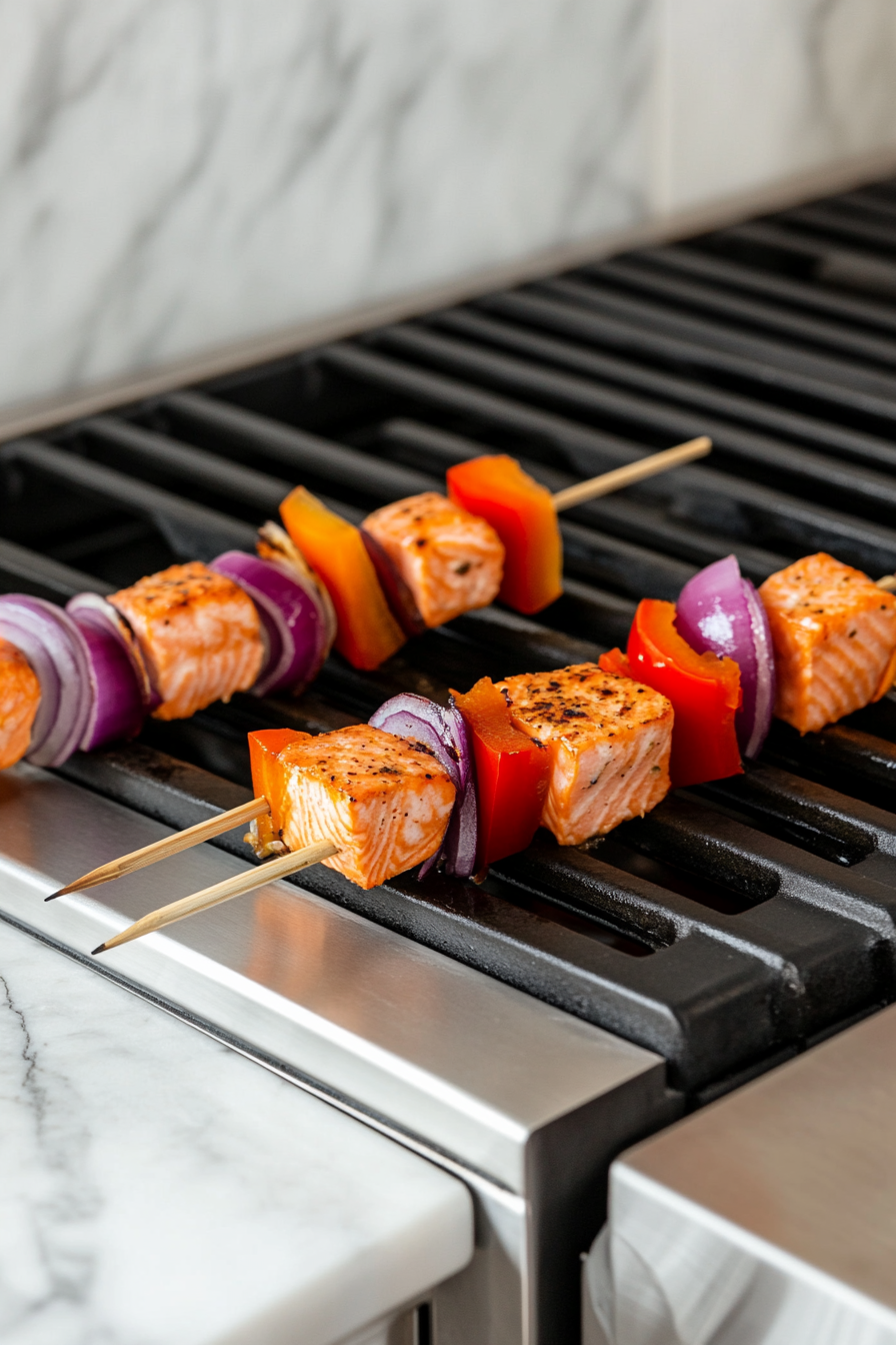 Thread a red bell pepper, a piece of salmon, and a red onion onto two skewers, repeating the sequence. Aim for 4-5 salmon cubes per skewer for easier handling.