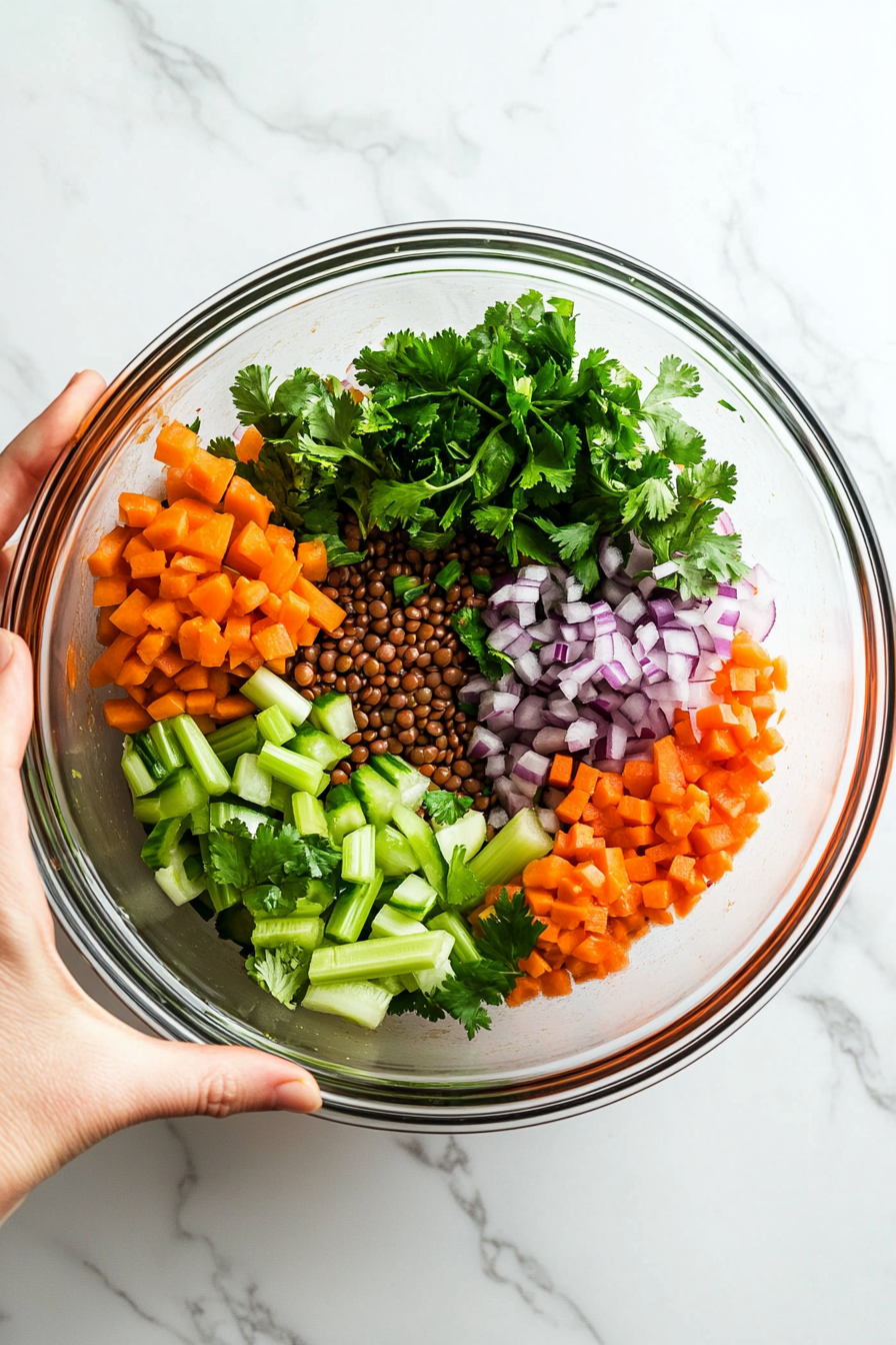 In a mixing bowl, toss lentils, carrots, celery, onions, garlic, cilantro, parsley, olive oil, sherry vinegar, salt, pepper, and lime. Adjust seasonings to taste and set aside.
