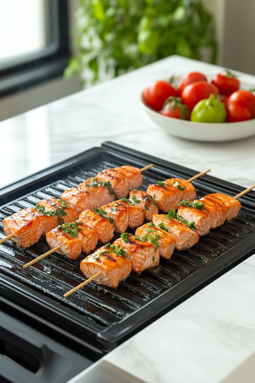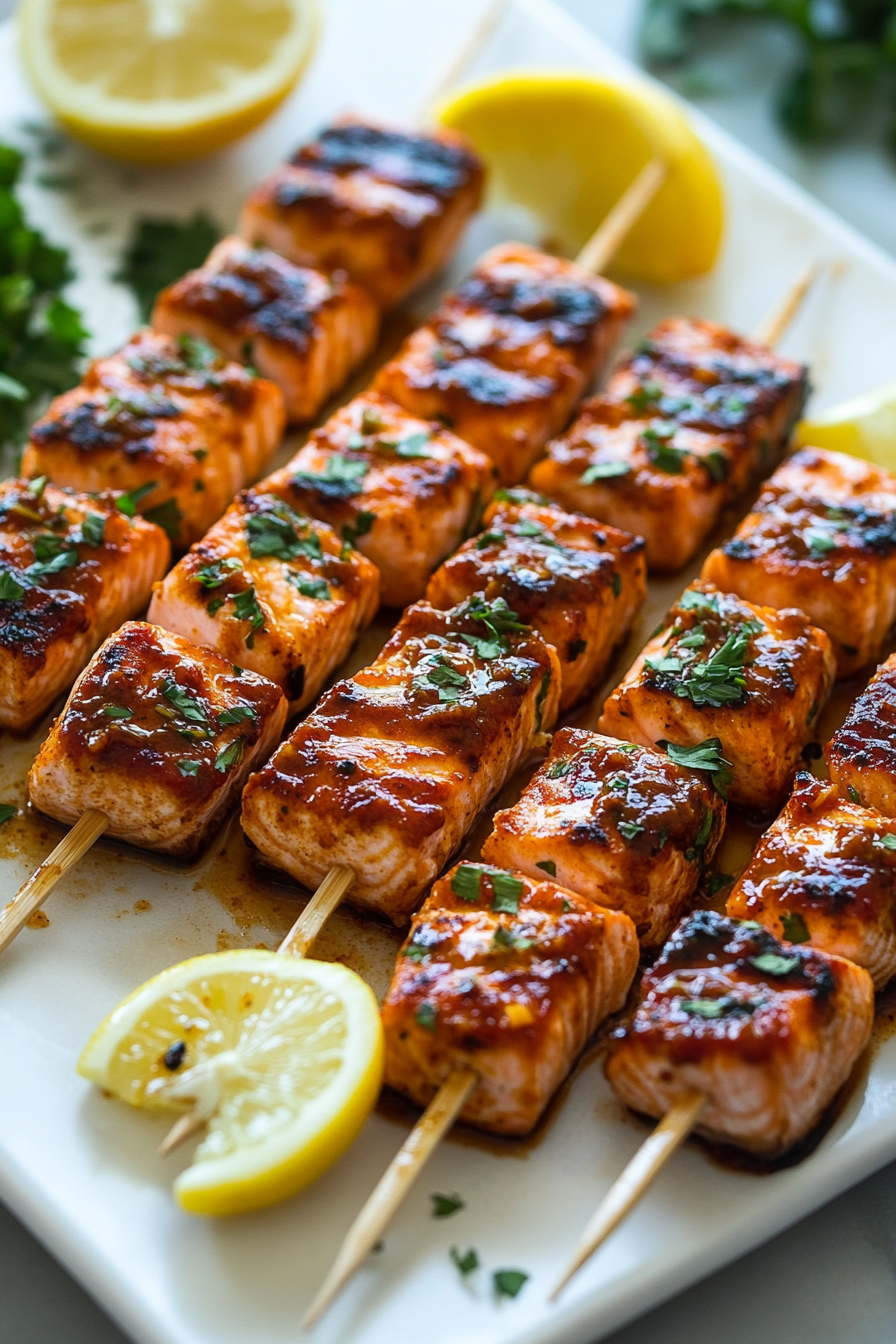 Grill the salmon skewers for 8-10 minutes, brushing with Harissa BBQ sauce and flipping halfway through, until the salmon is opaque throughout.