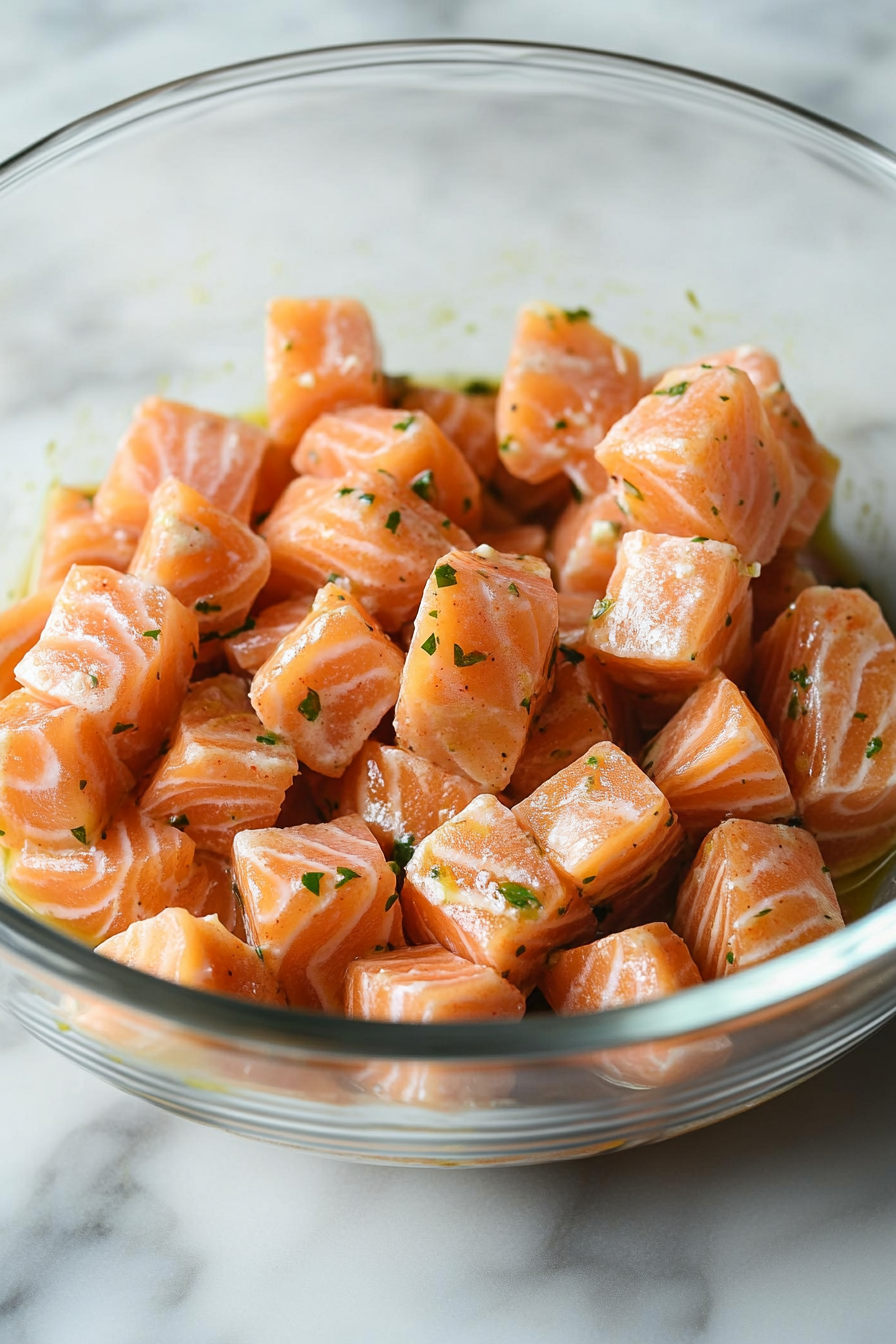 In a bowl, combine salmon, harissa, preserved lemon, lemon juice, granulated garlic, smoked paprika, Dijon mustard, and honey. Toss well and let marinate for 30 minutes.