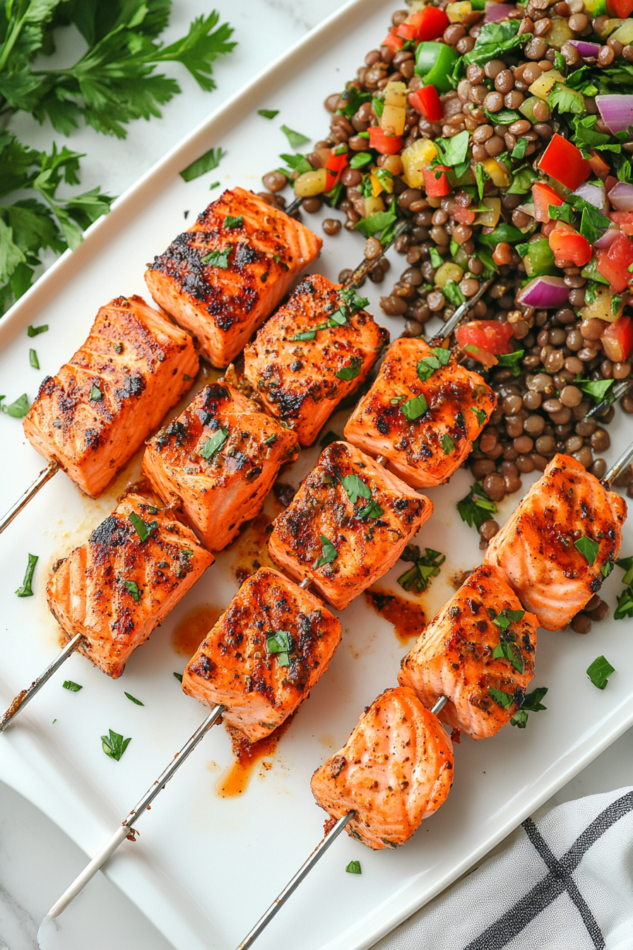 Brush the kebabs with additional sauce and serve alongside the lentil salad. Enjoy!