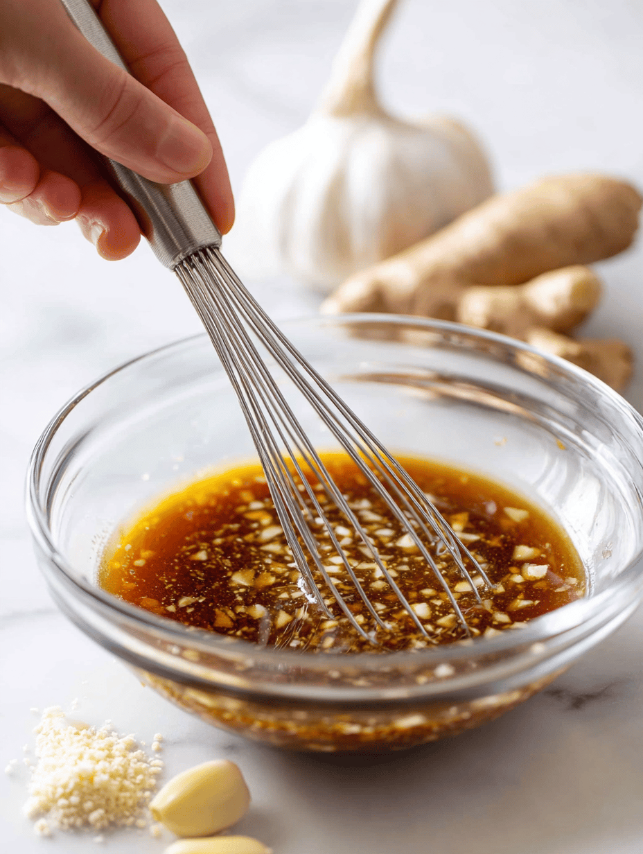 In a mixing bowl, whisk together soy sauce, honey, minced garlic, grated ginger, rice vinegar, sesame oil, and chili flakes until well combined and slightly thickened.