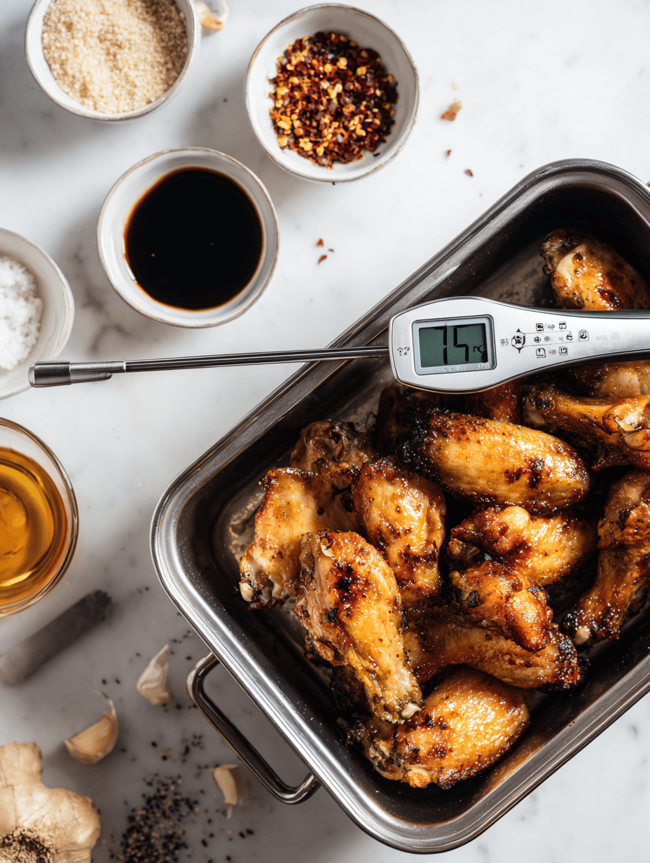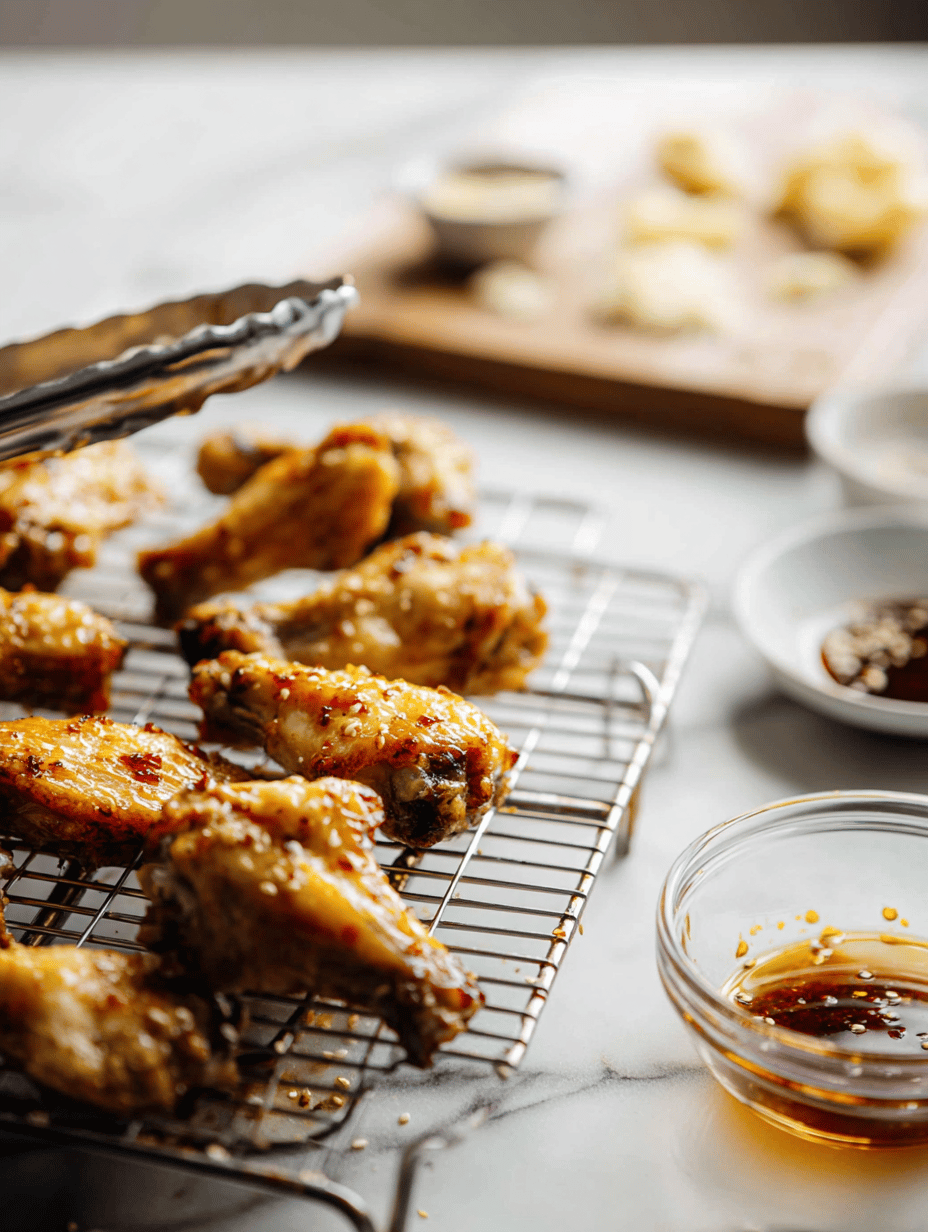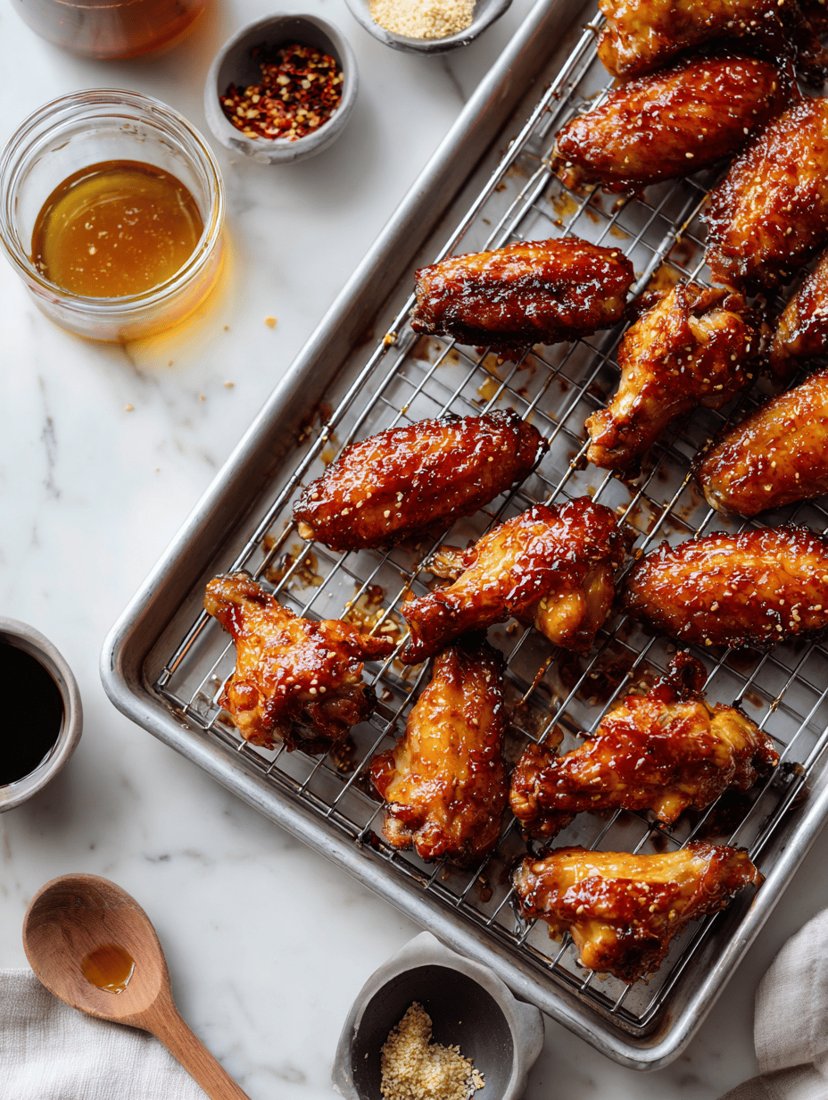 Once cooked, remove the wings from the oven and let them rest for 5 minutes. This allows the juices to redistribute and the glaze to set, resulting in a shiny, sticky finish.