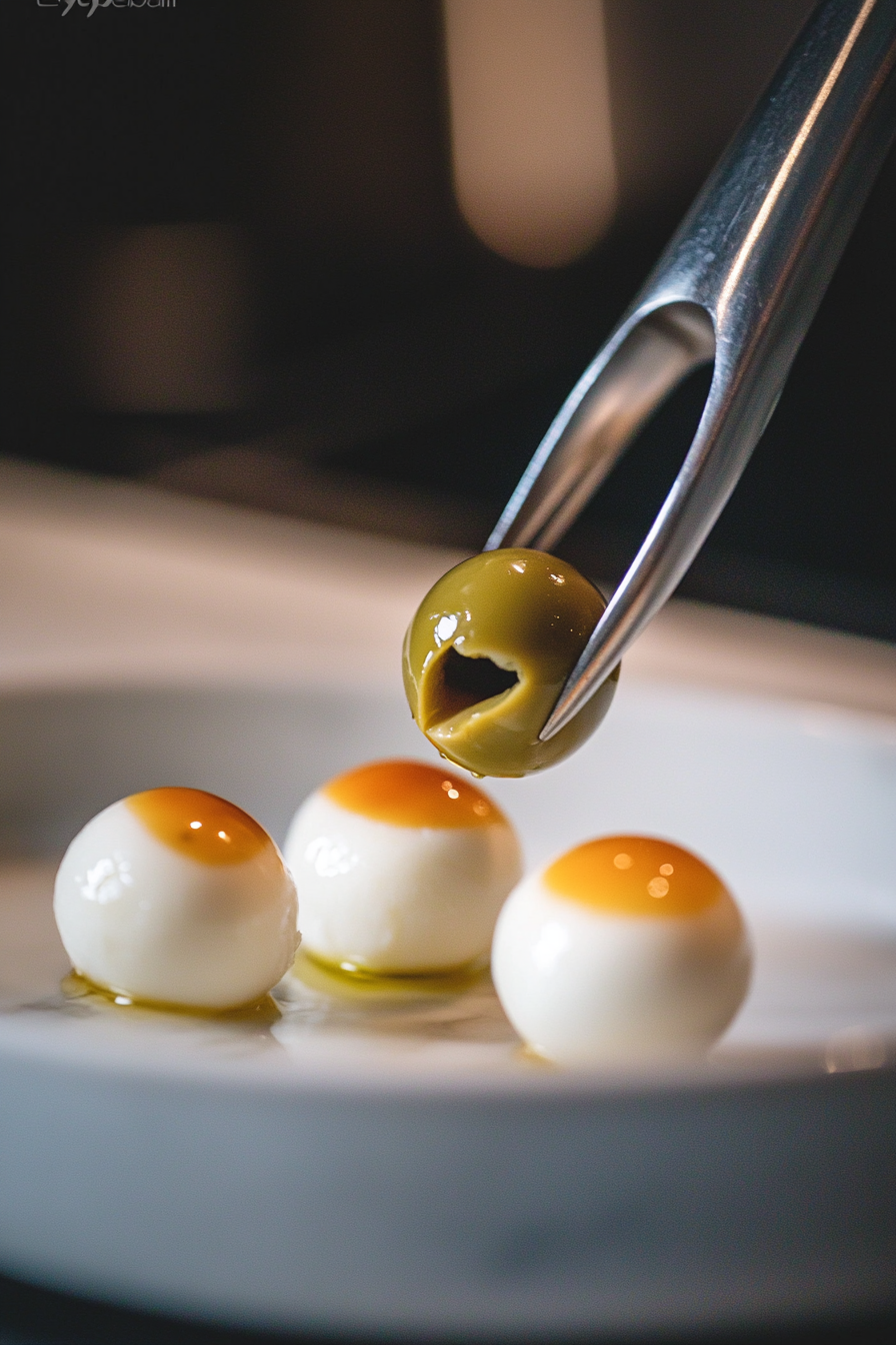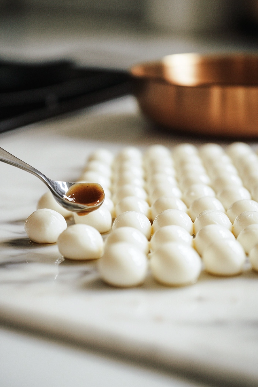 Use a melon baller or small spoon to carve a small hole in each mozzarella pearl.
