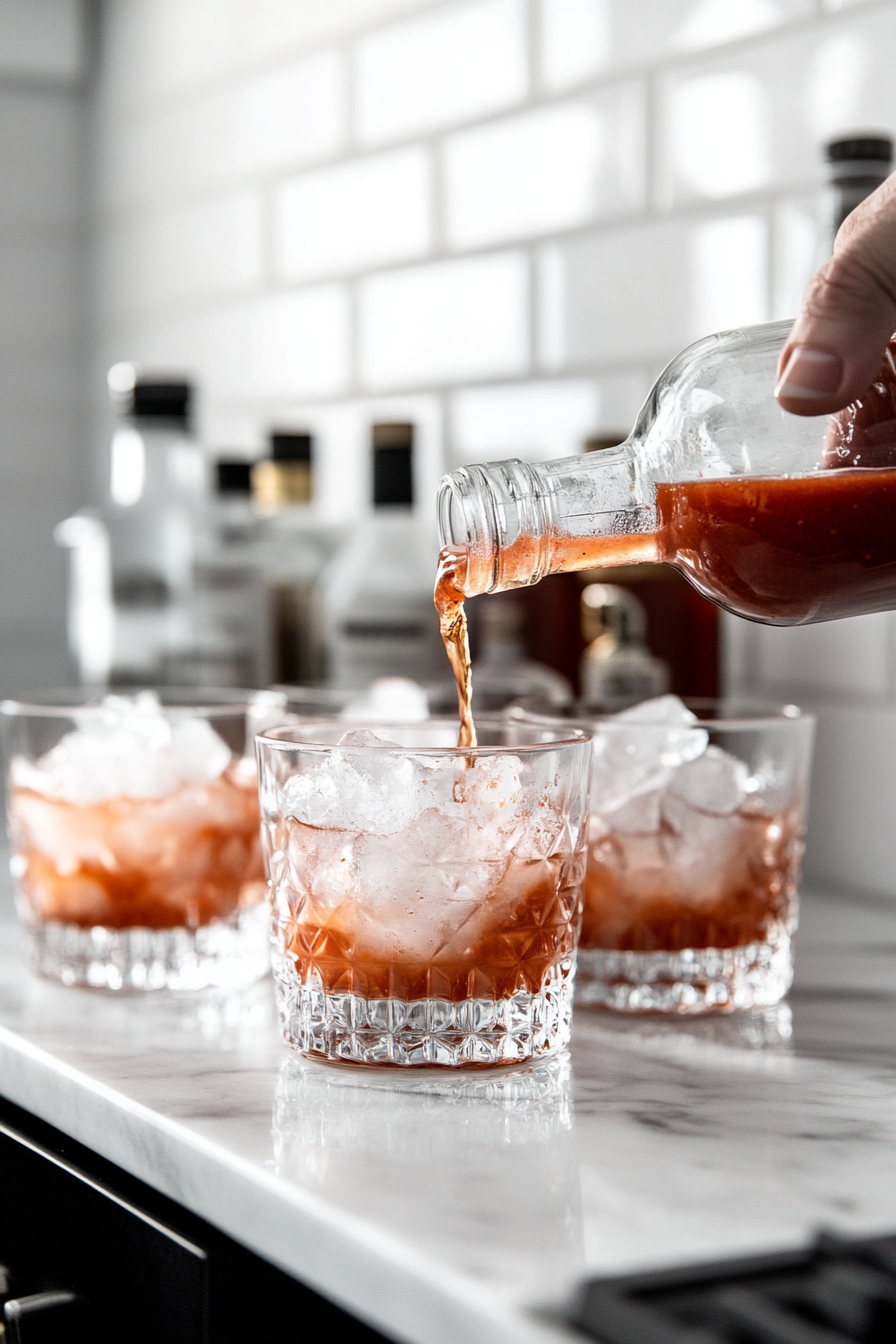 Prepare glasses with ice and add 3 parts Bloody Mary mix to 1 part vodka (e.g., 6 ounces mix with 2 ounces vodka), adjusting to taste.