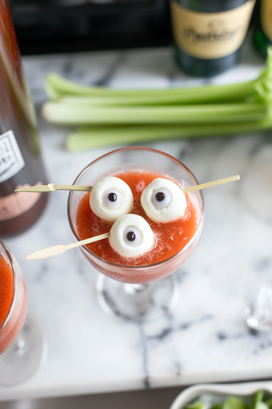 Skewer 2-3 mozzarella “eyeballs” onto a cocktail pick and place in each drink along with a celery stick.