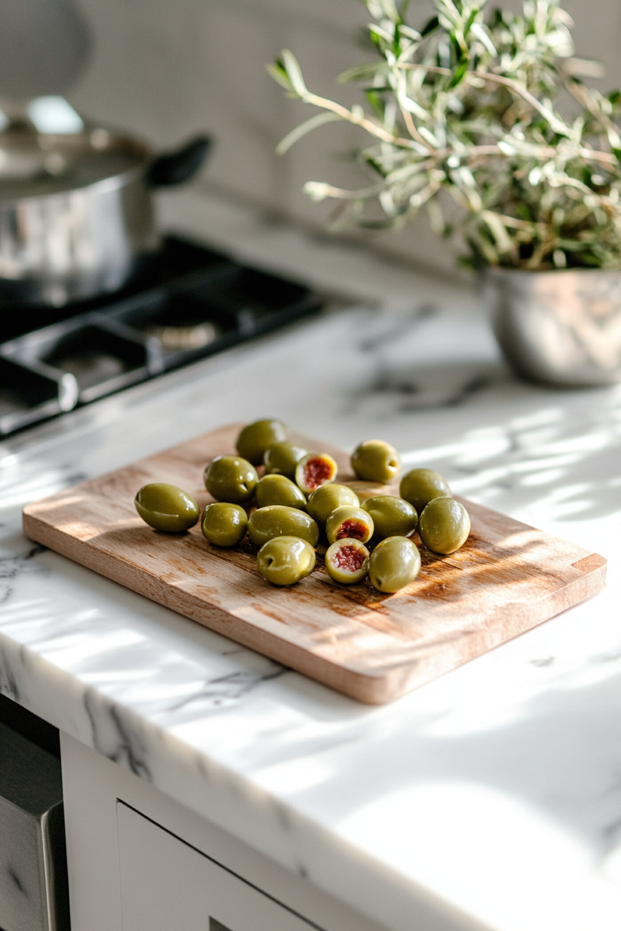 To make the “eyeball” garnish, thinly slice olives with pimentos intact.