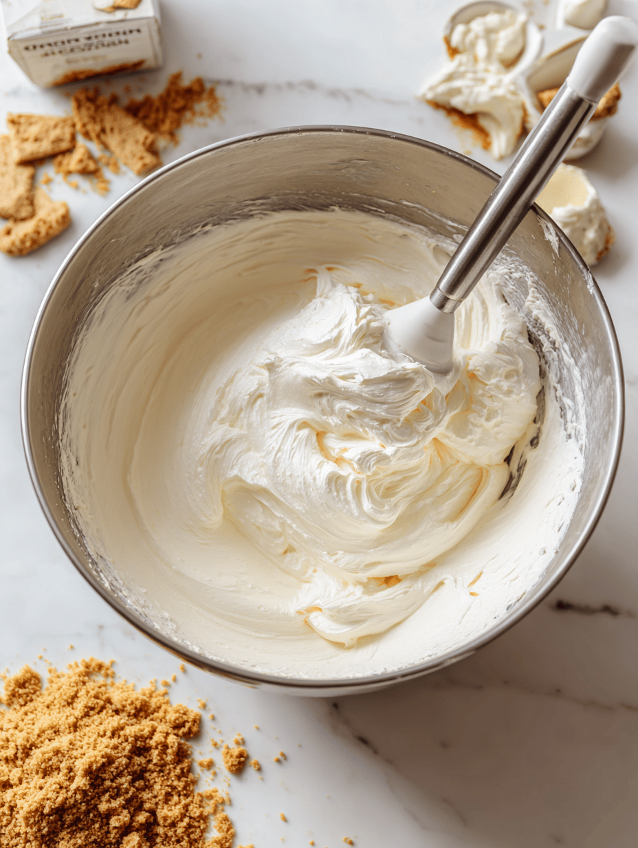 Spread the fluffy cream cheese mixture over the top layer of crumbs, smoothing it out with a spatula for an even surface.