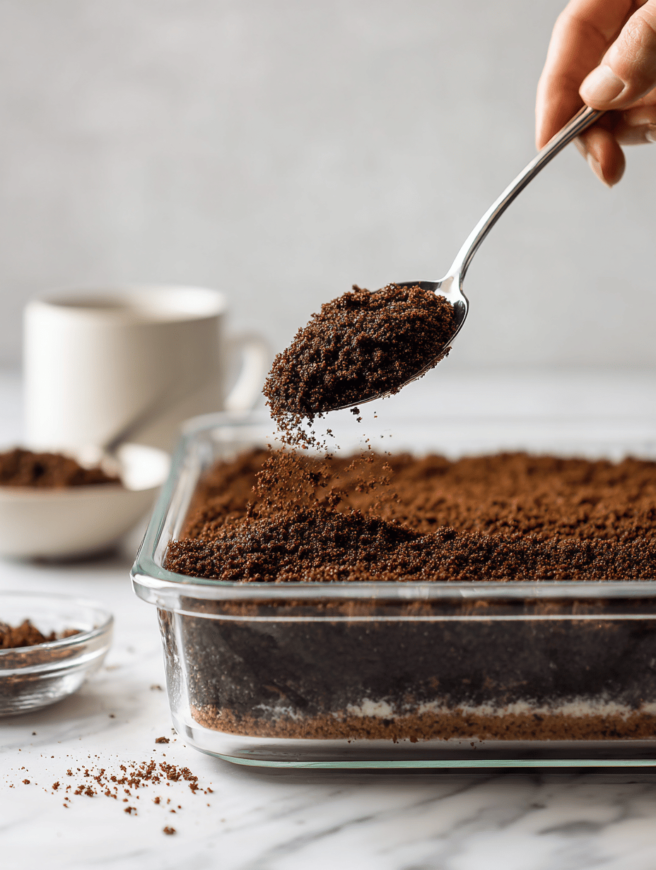 Start assembling the dirt cake by spreading a thin layer of cookie crumbs at the bottom of your dish, creating a sandy base.