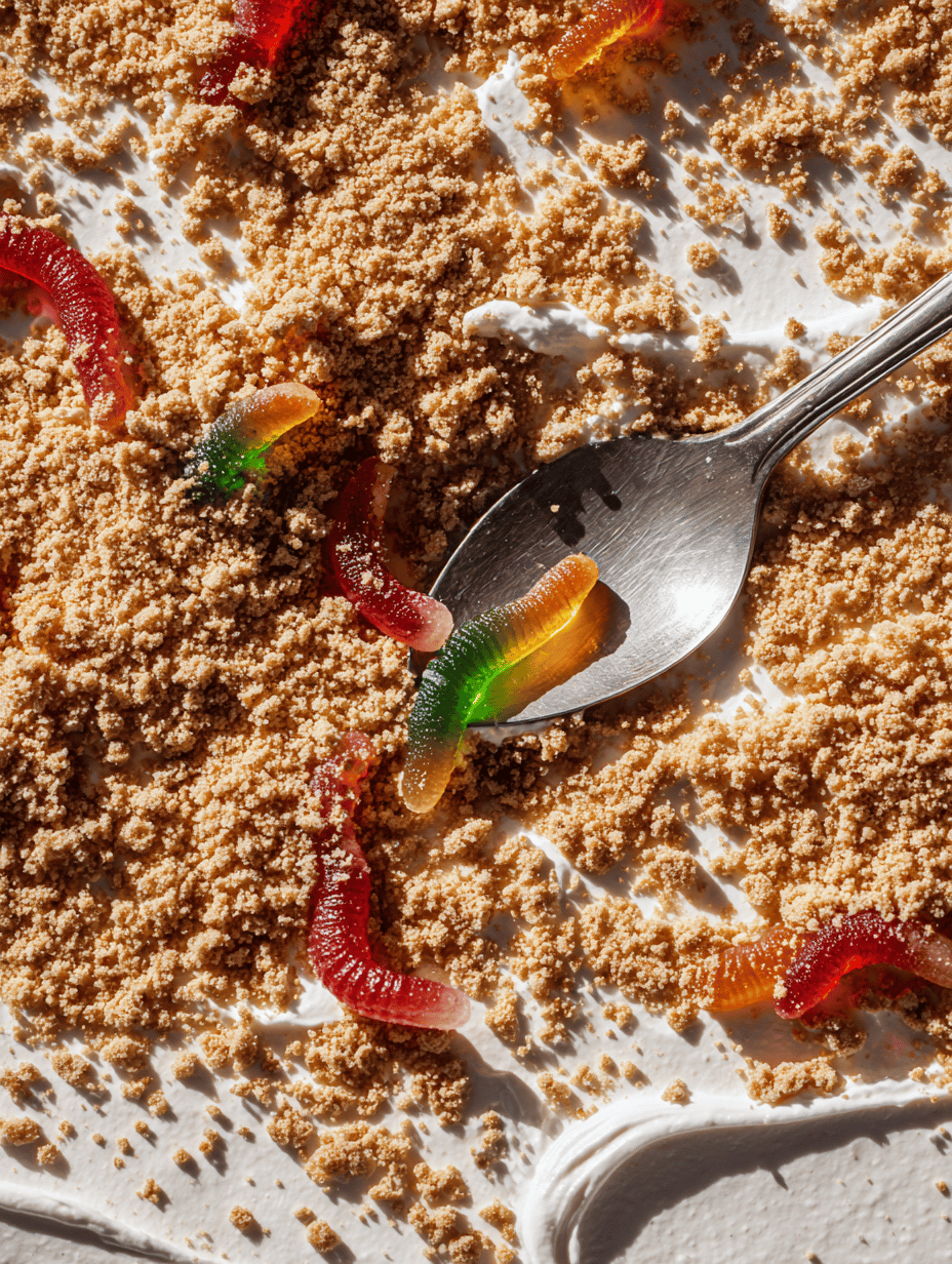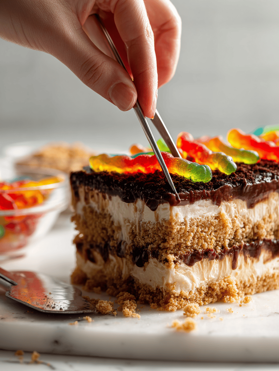 Sprinkle remaining cookie crumbs over the surface to resemble dirt, then press gummy worms into the crumb layer at odd angles to look like buried worms emerging.