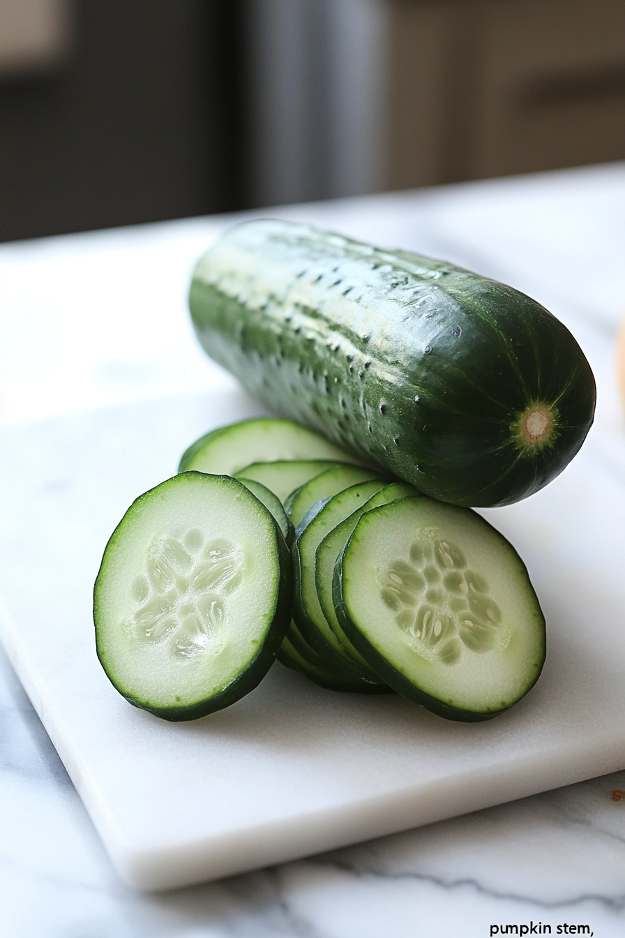 Cut a few inches off the end of a cucumber, then slice that piece in half to create a pumpkin stem.