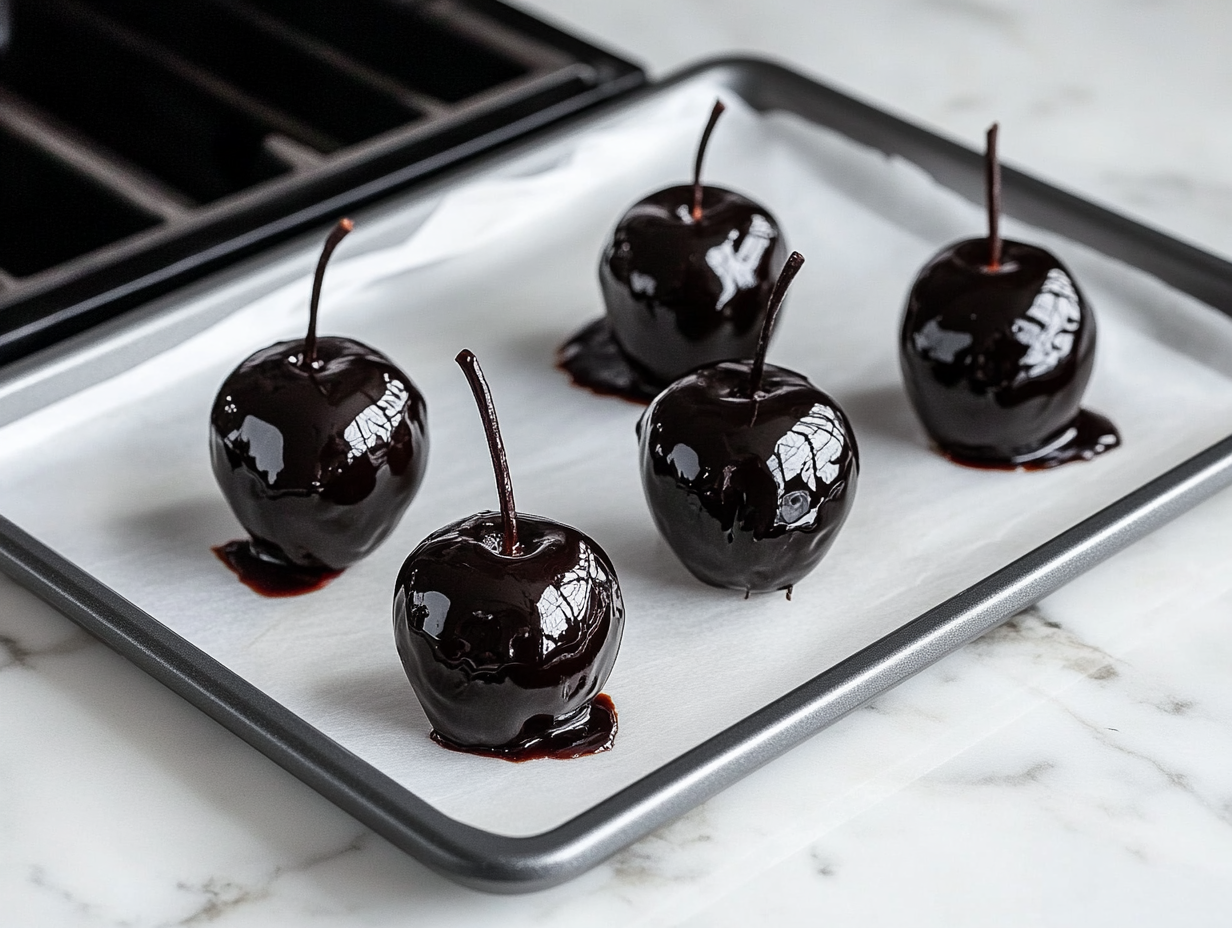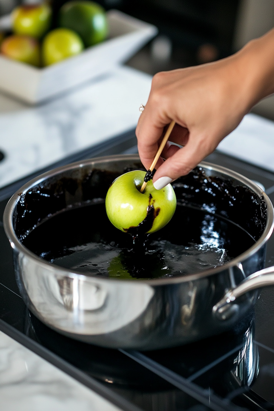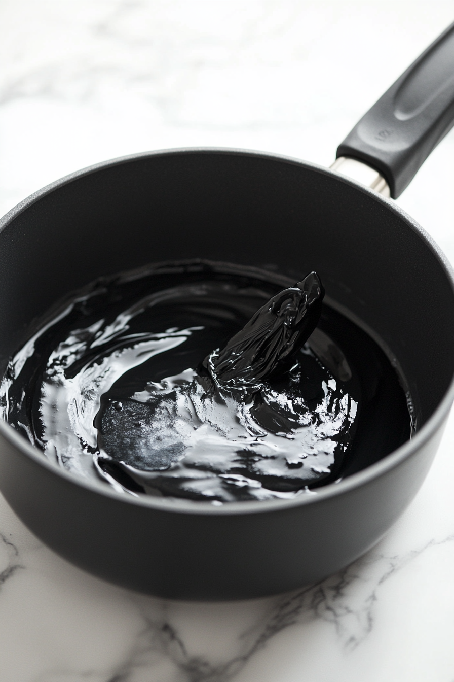 In a saucepan, combine sugar, water, corn syrup, and black food coloring.