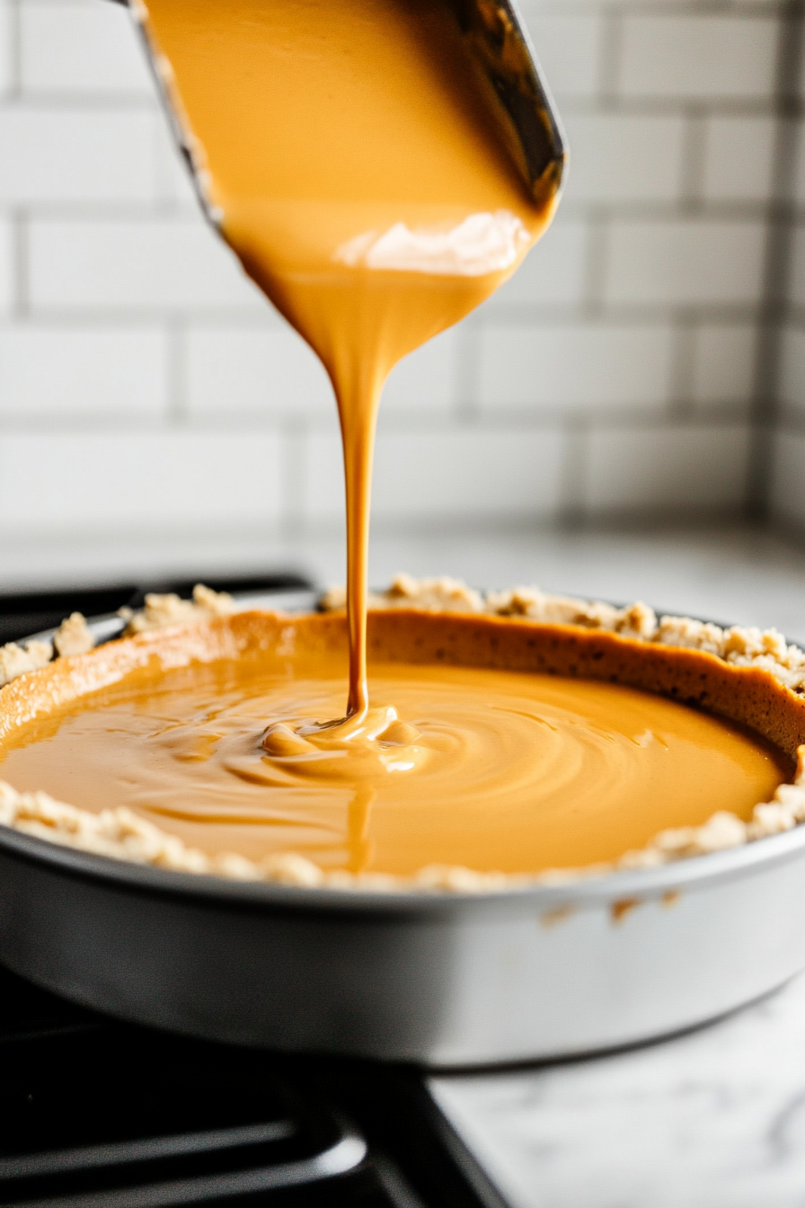 Pour the filling over the cooled crust, smoothing it evenly.