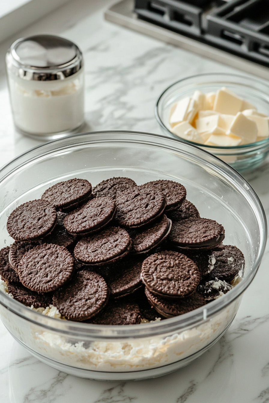For the crust, pulse cookies in a food processor until finely ground. Gradually add melted butter and pulse until combined.